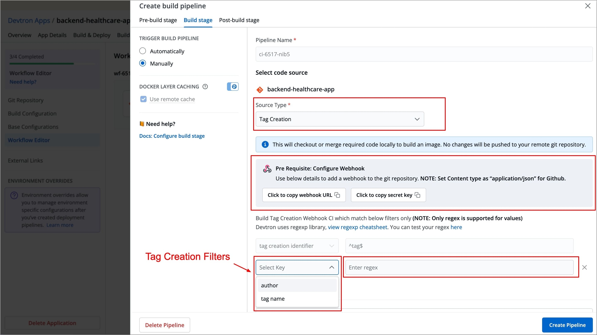 When using Tag Creation as a source type, Devtron allows you to filter which tags should trigger a build based on the following filters