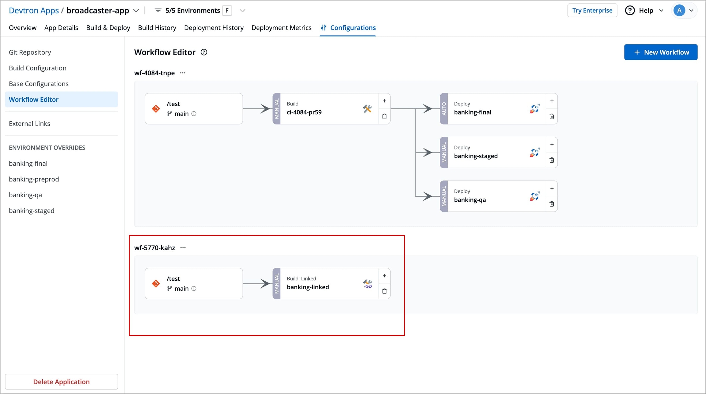 Override Options in Build Stage lets you override Build Configurations for each workflow of the same application. You can configure overrides in the build stage of each workflow.