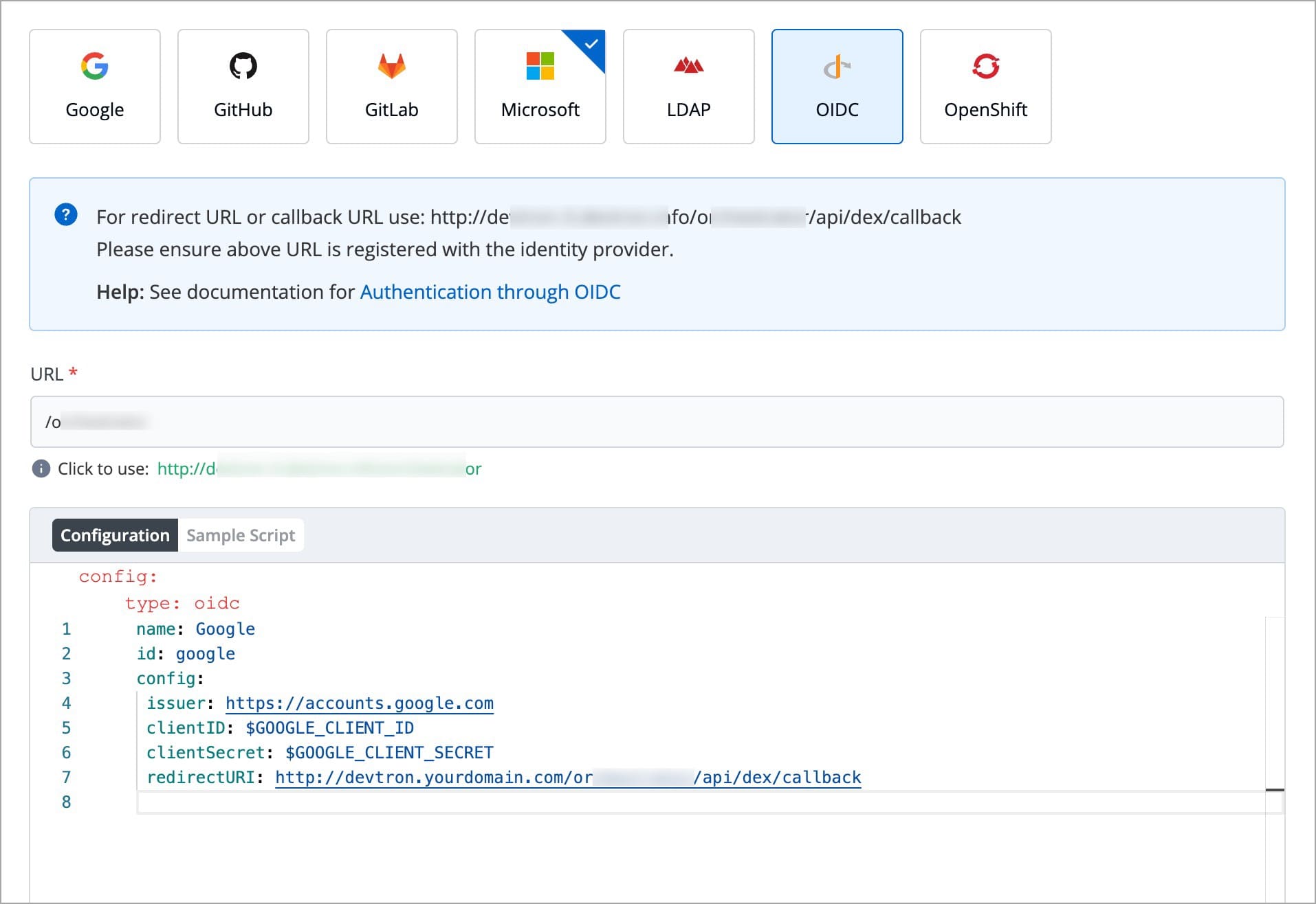 Devtron provides a sample configuration out of the box. There are some values that you need to either get from your SSO provider or give to your SSO provider.