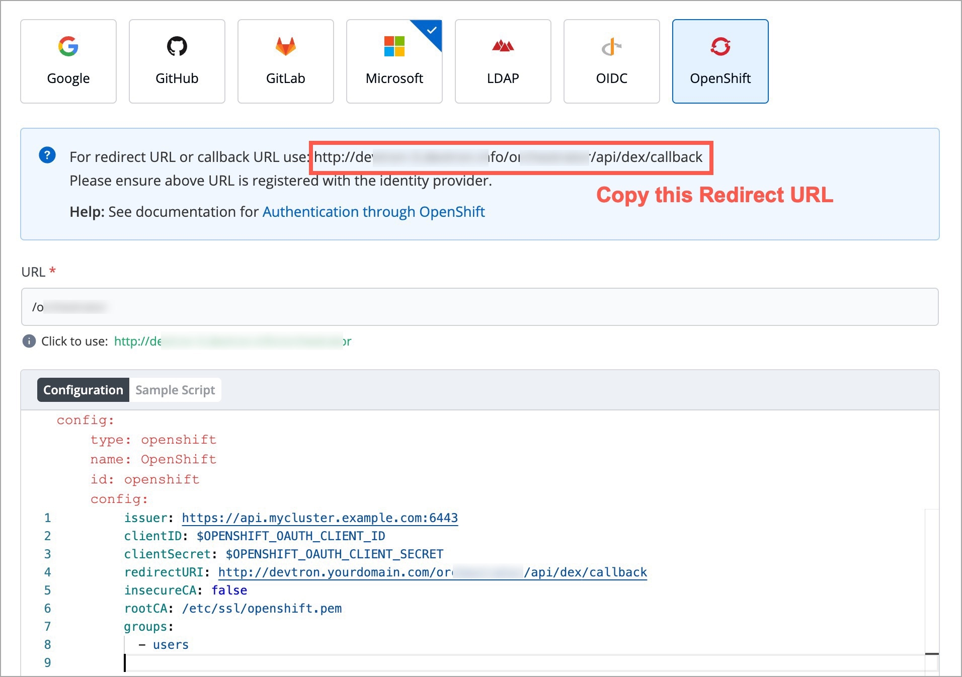Copying Redirect URI from Devtron
