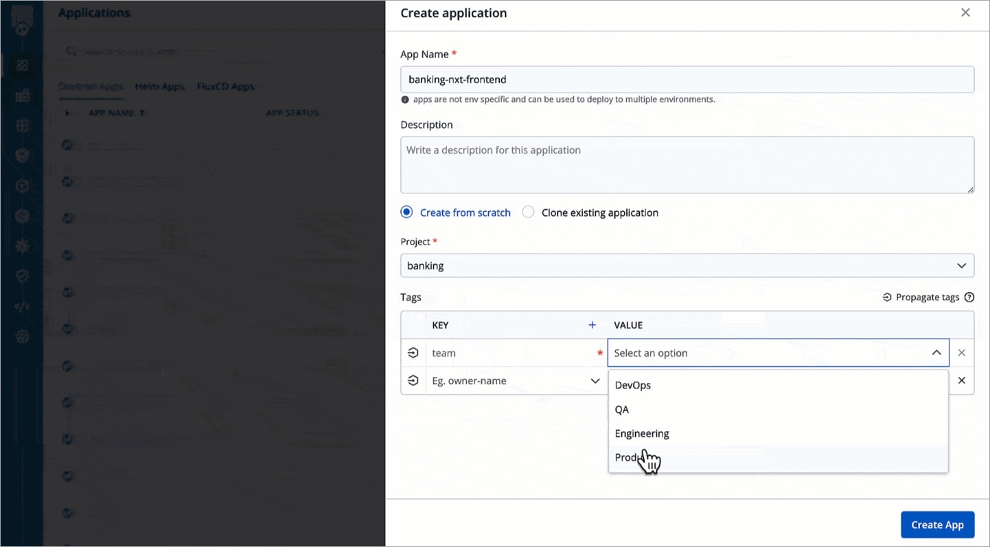 If tag propagation for a project is disabled globally, you can still enable it for individual applications. During the application creation process, you have the option to enable tag propagation specifically for that application. By doing so, the tags assigned to that application will be propagated as labels to the associated Kubernetes resources.