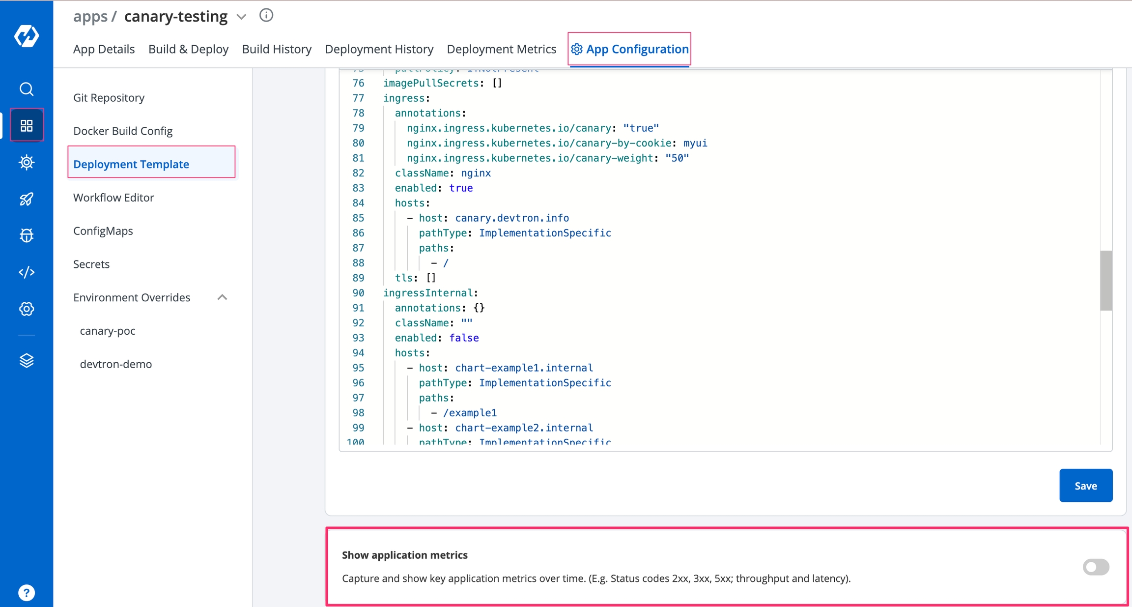 Enable show application metrics toggle to view the application metrics on the App Details page.