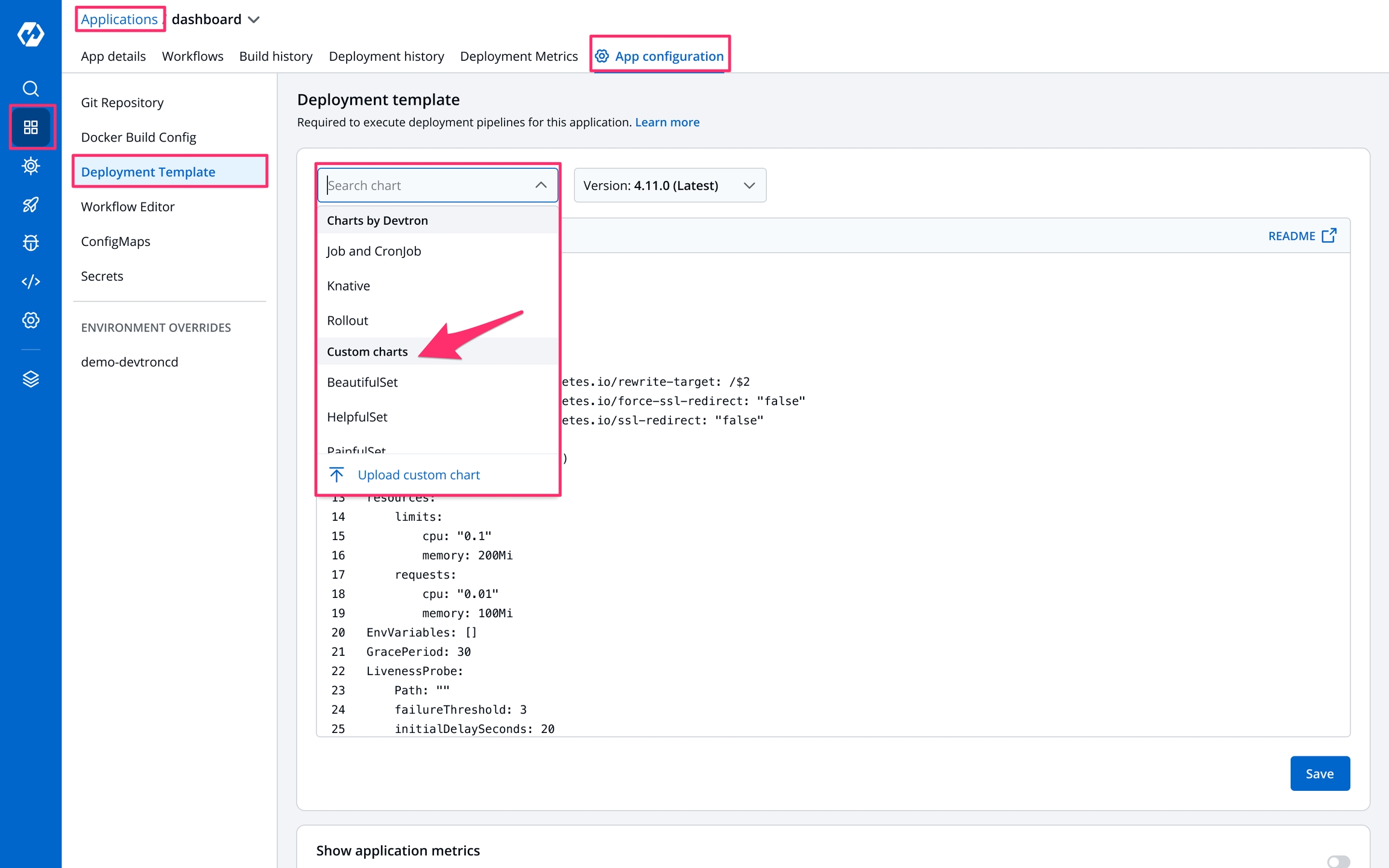 A deployment configuration is a manifest of the application. It defines the runtime behavior of the application. You can select one of the default deployment charts or custom deployment charts which are created by super admin.