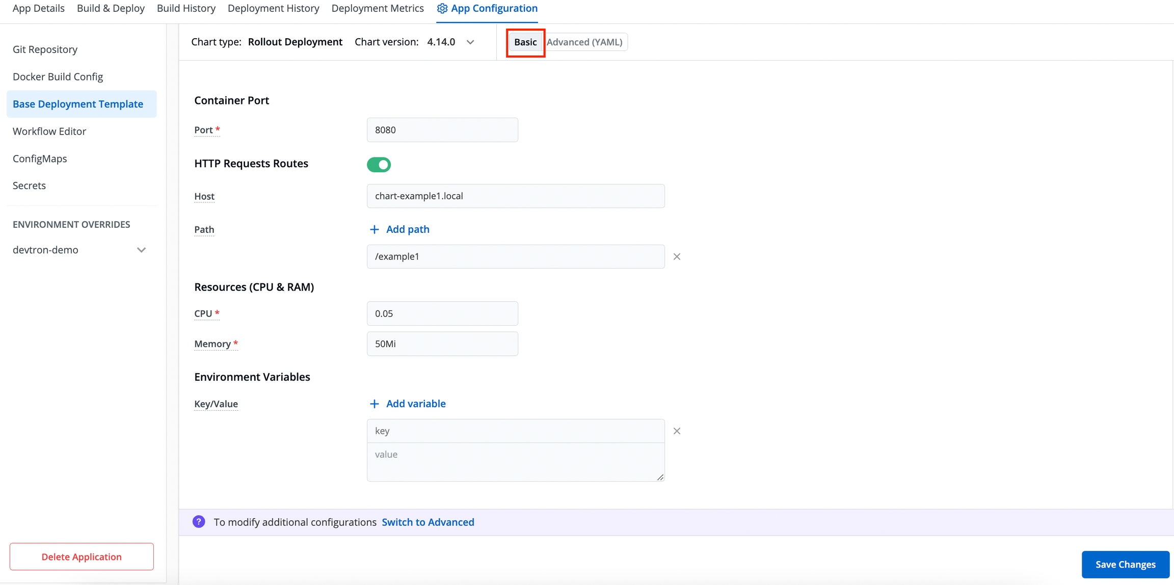 Some of the use-cases which are defined on the Deployment Template (YAML file) may not be applicable to configure for your application. In such cases, you can do the basic deployment configuration for your application on the Basic GUI section instead of configuring the YAML file.
