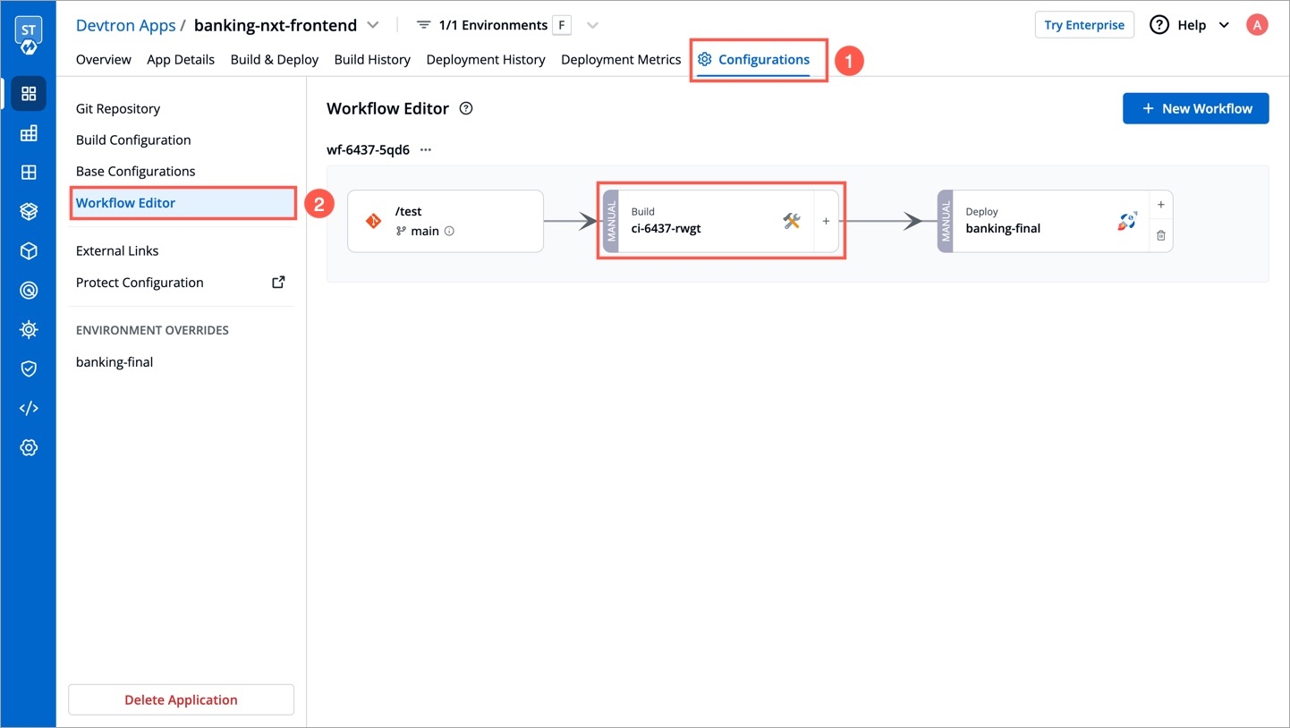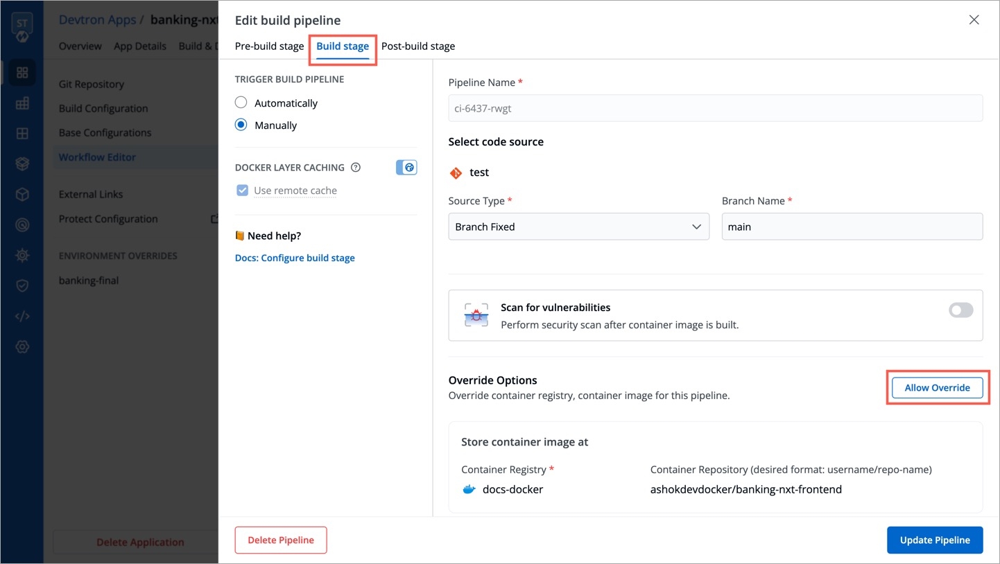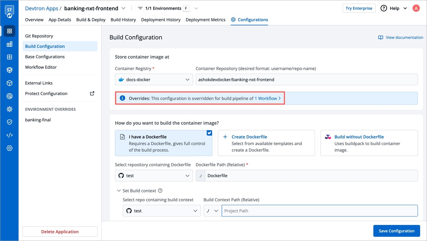 The overridden container registry/container image location/target platform will be reflected on the Build Configuration page. You can also see the number of build pipelines for which the container registry/container image location/target platform is overridden.