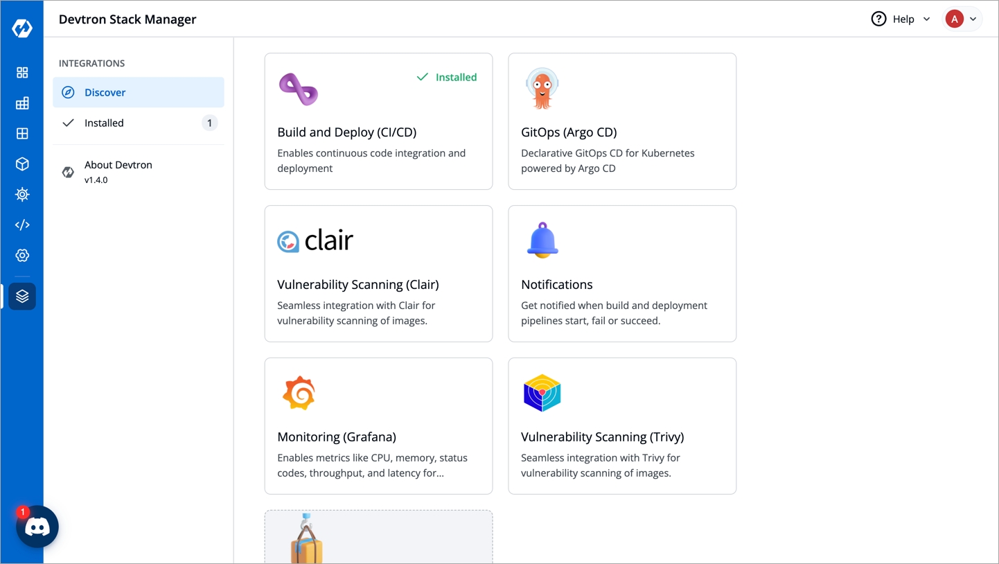 Select Devtron Stack Manager from the left navigation bar. Under INTEGRATIONS, select Discover.