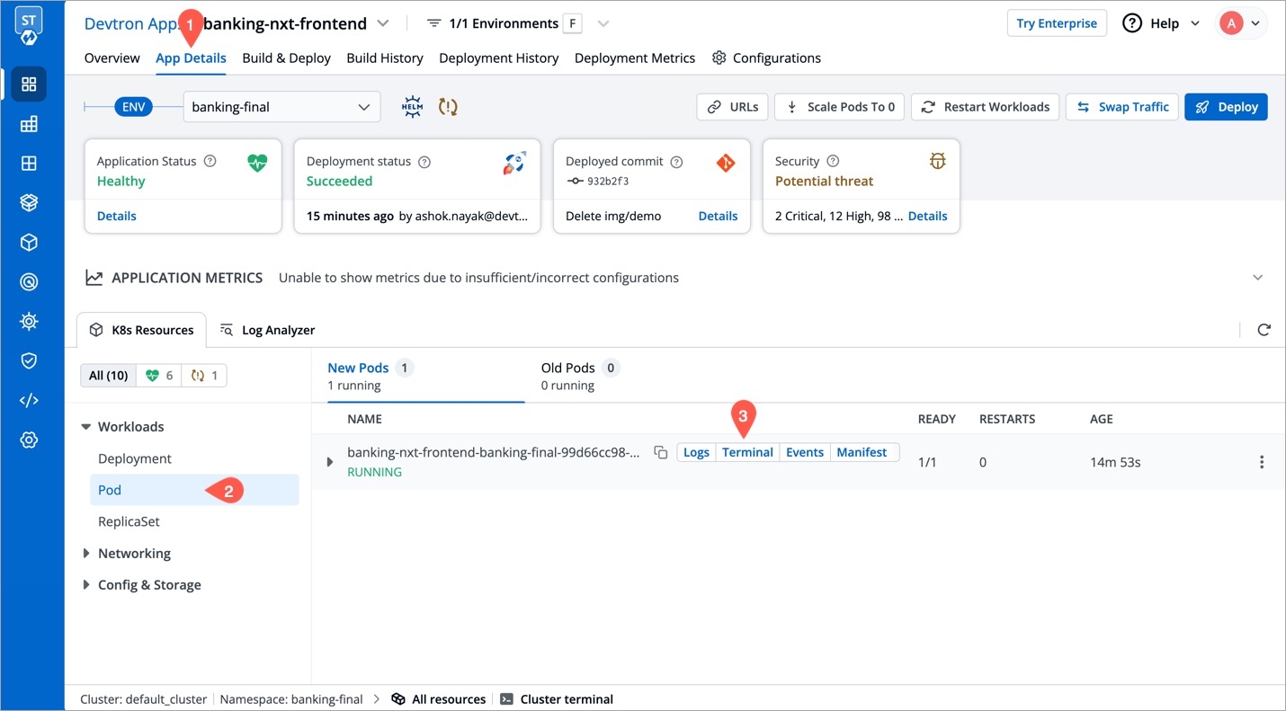 Application metrics can be enabled to see your application's metrics-CPU Service Monitor usage, Memory Usage, Status, Throughput and Latency.