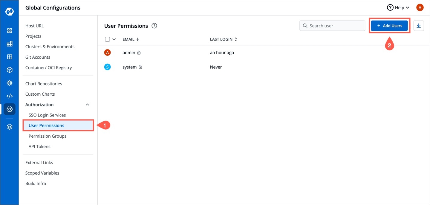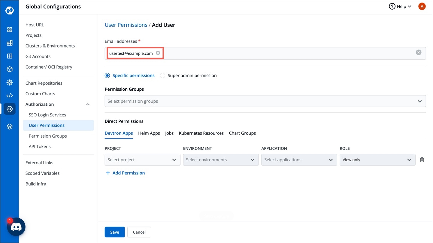 Figure 13: Adding Users to Devtron In the Email addresses field, enter the email address of the user you created in Keycloak.