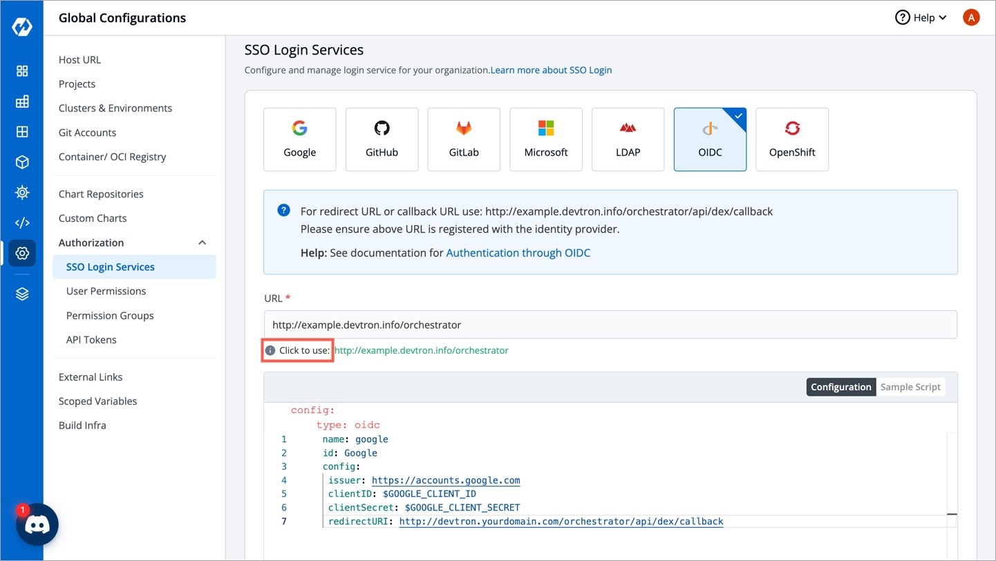Figure 10: Choosing OIDC SSO Below the URL field, take the help of the Click to use option to populate the exact URL if the displayed one is incorrect.
