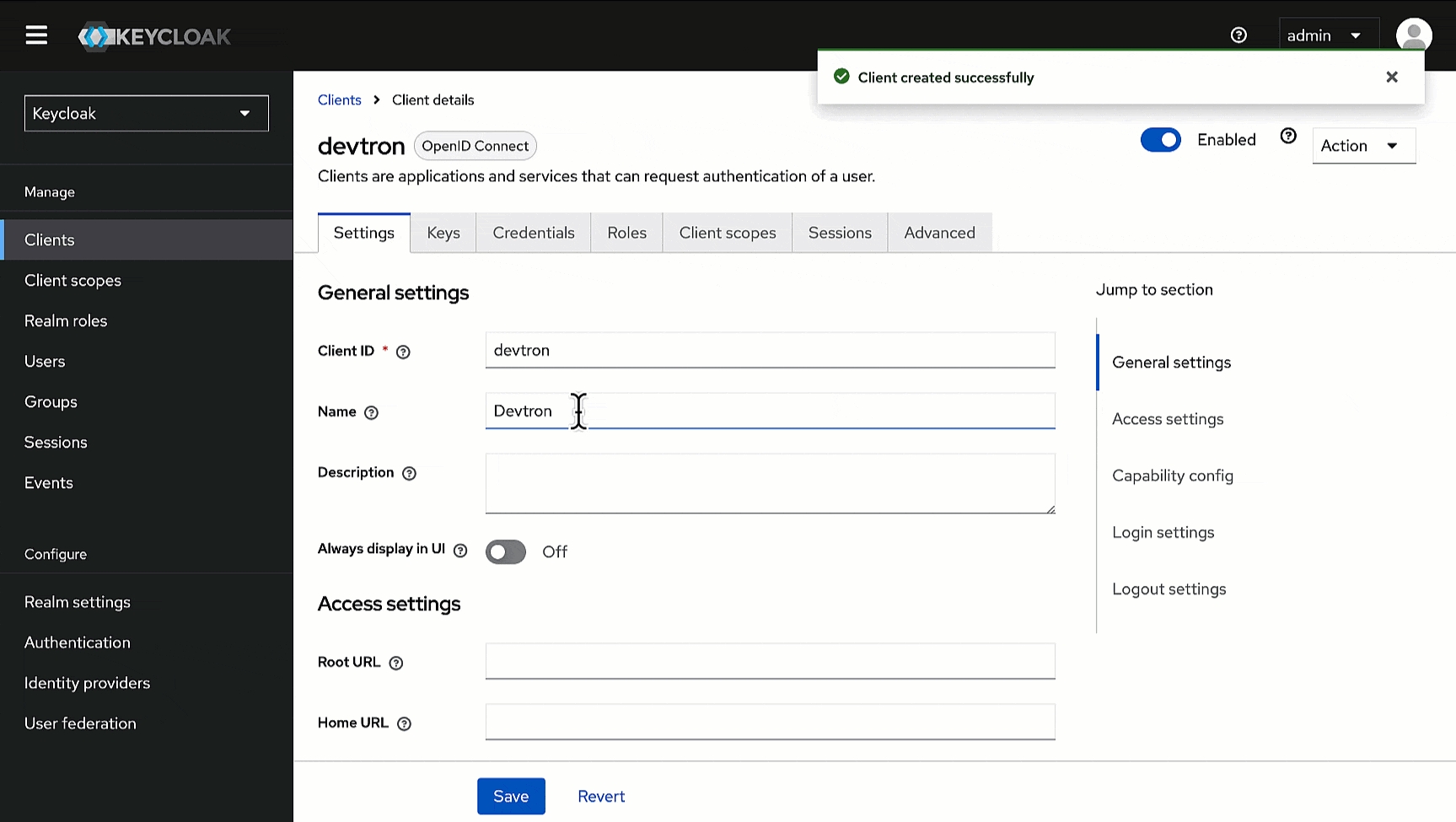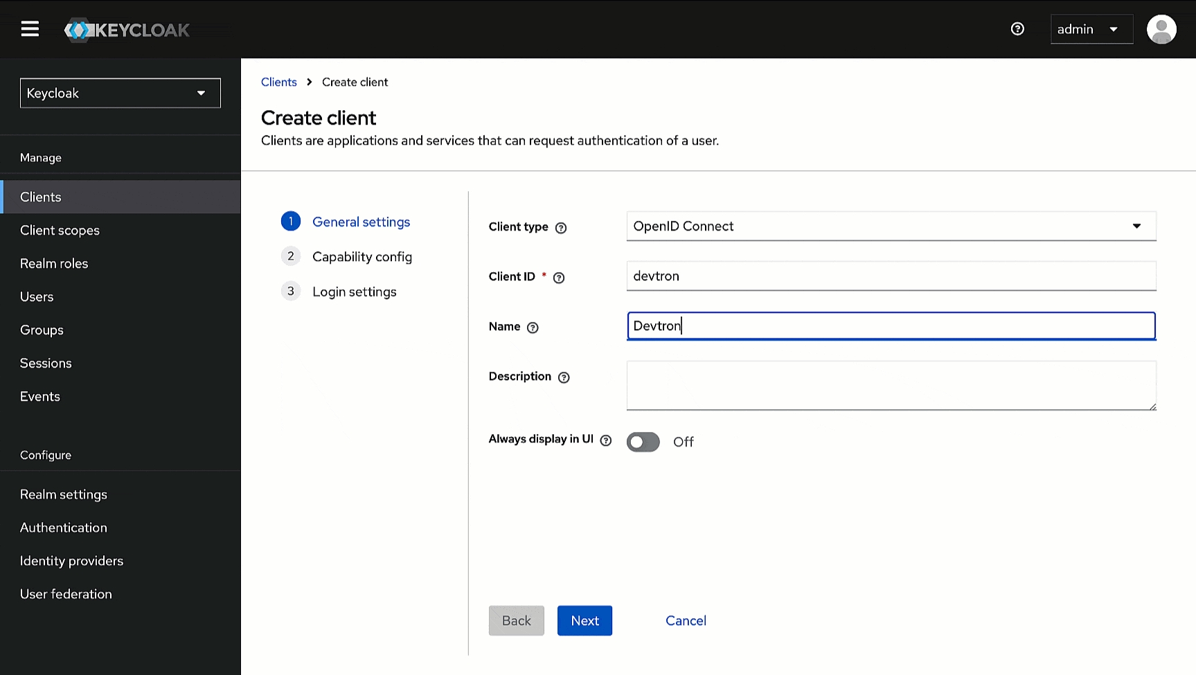 Here, we will add Devtron as a client for using Keycloak SSO.