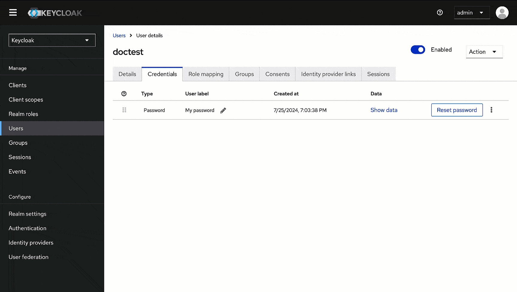 Here, we will create a user that can log in to Devtron via SSO. We will assign a username and password that the user can enter while logging in to Devtron via Keycloak SSO.