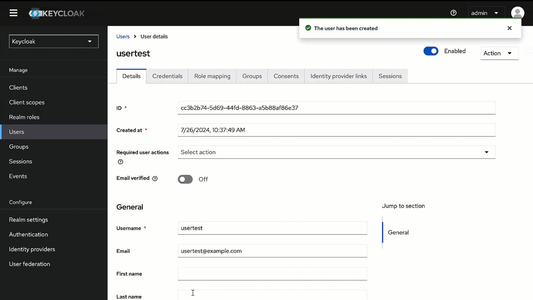 Give a username (e.g., usertest) in the Username field and enter the user's email address (e.g., [email protected]) in the Email field.