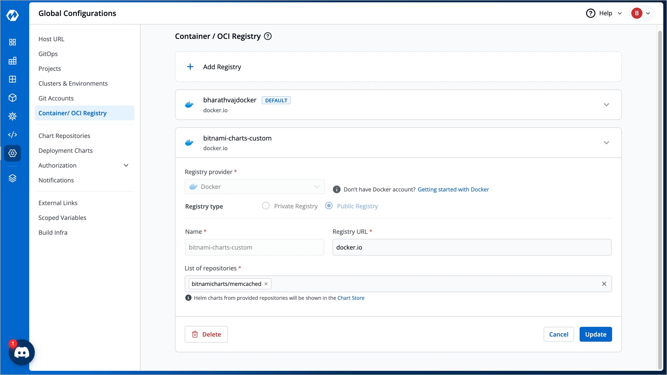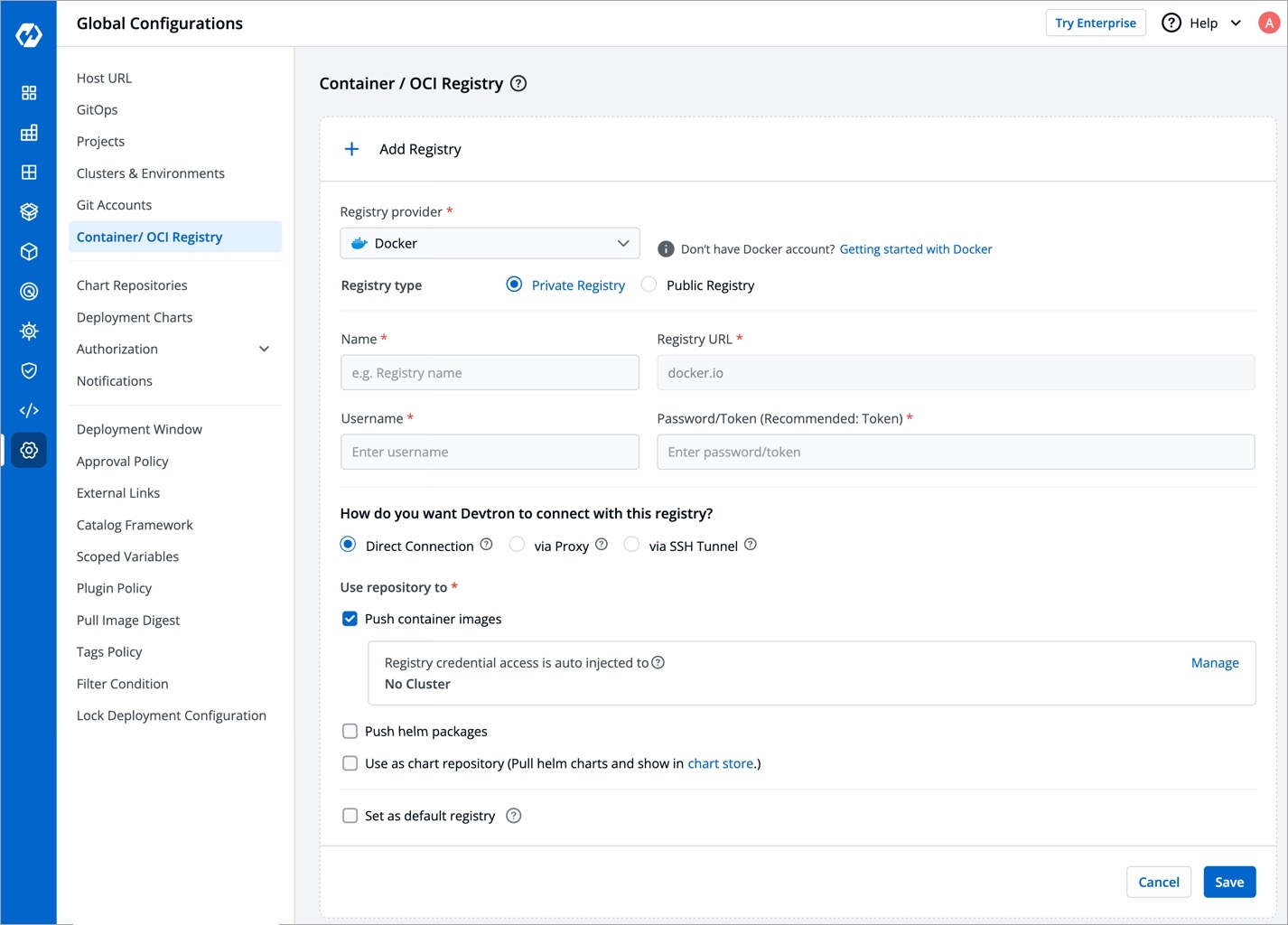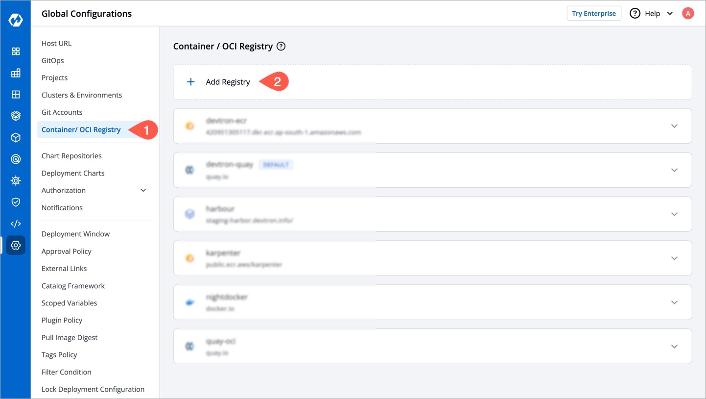 From the left sidebar, go to Global Configurations → Container/OCI Registry.