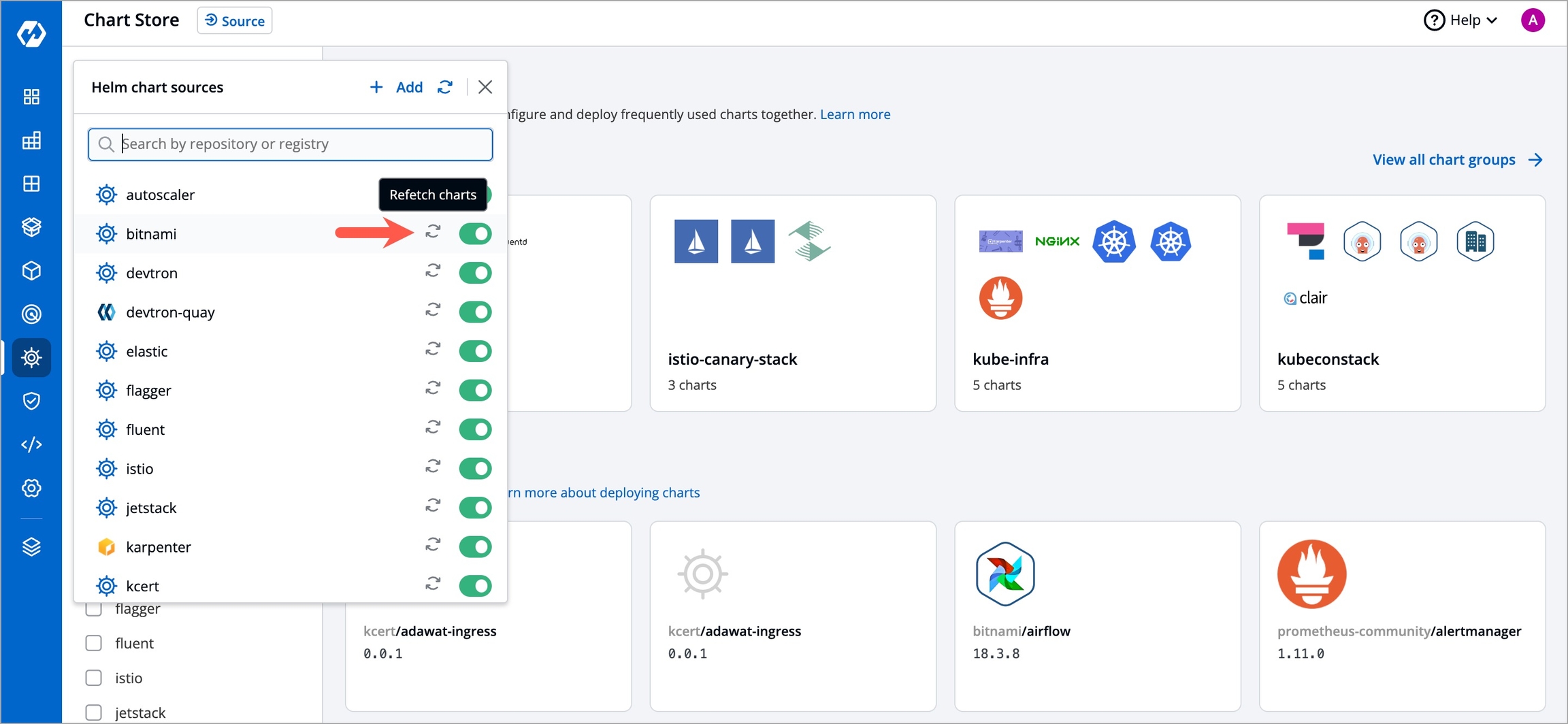 In the Devtron's Discover Chart section, if you are not able to see any charts available, goto Global Configuration >> Chart Repositories and click on Refresh Chart at the top-right as shown in the image below. After clicking the button, it might take 4-5mins to show all the charts in Discover section depending upon the chart repositories added.