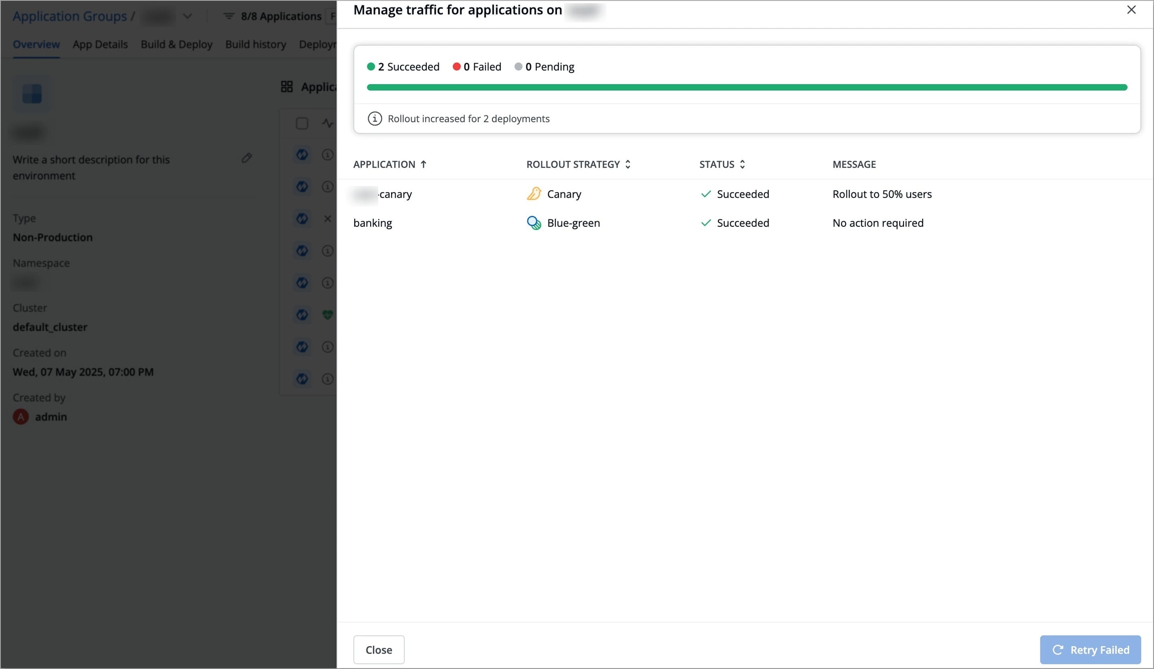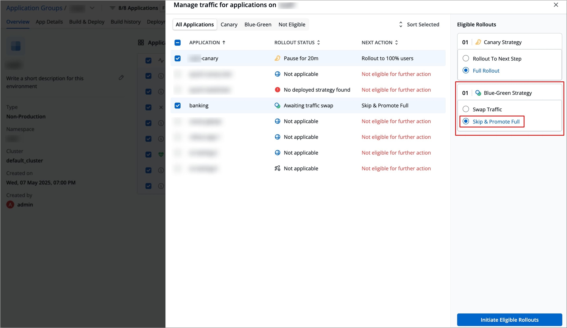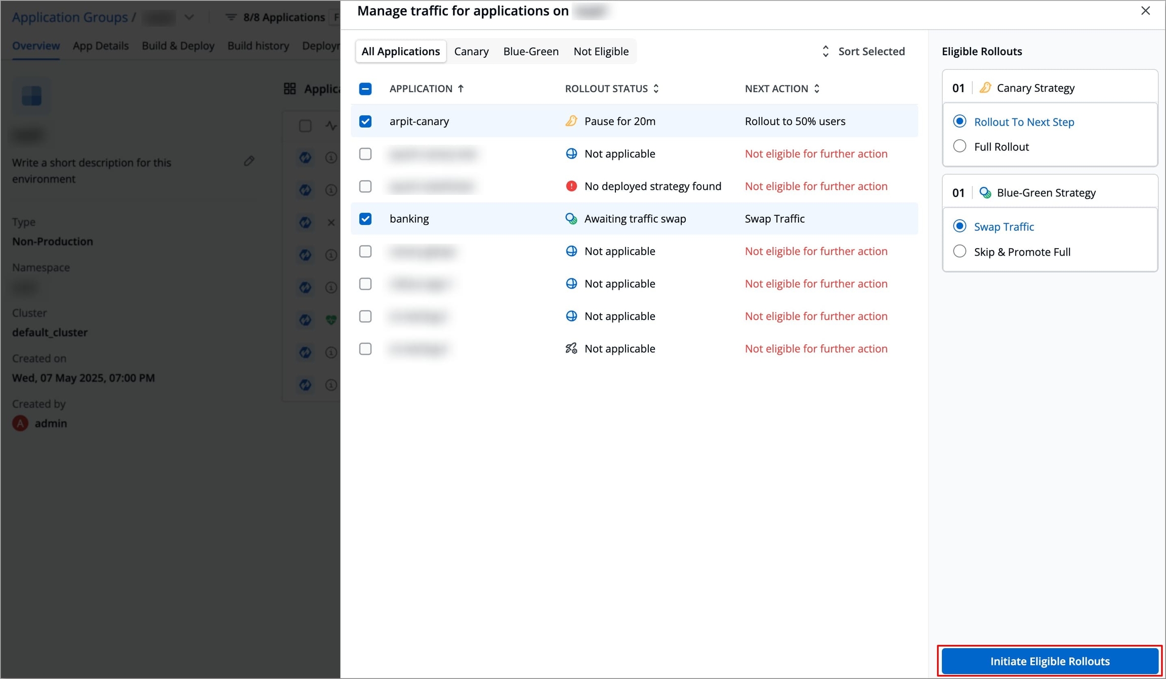 For Canary Deployments, you can either choose to initiate the next step or to initiate the full rollout.
