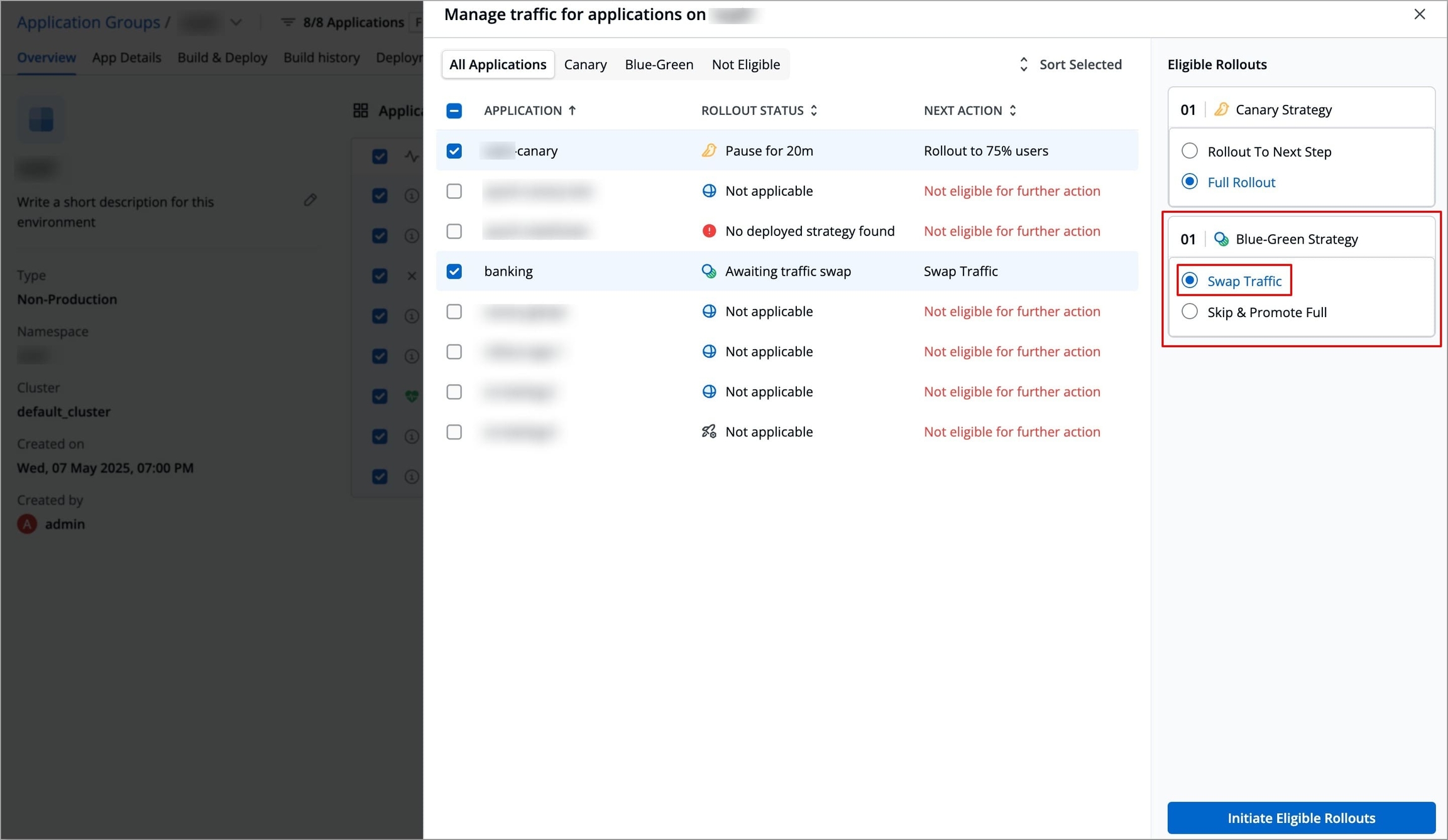 Figure 22: Selecting 'Swap Traffic' Skip & Promote Full: While deploying, this will directly deploy the whole traffic to application latest deployment.