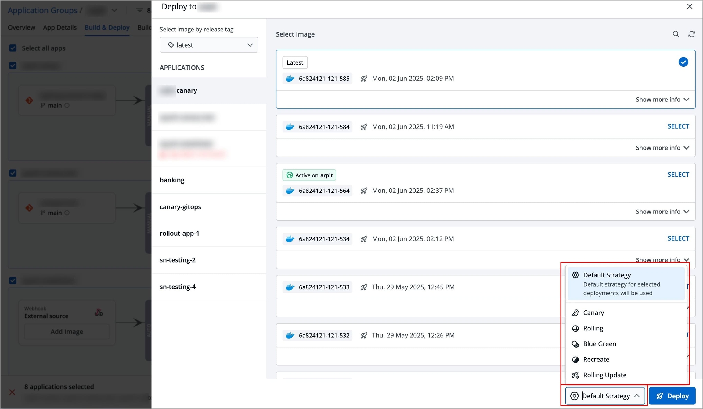 Figure 15: Deploying Apps If you wish, you can deploy all applications in an Application Group using a single deployment strategy; select the preferred deployment strategy for all the applications and click Deploy. By default, all applications will be deployed using their respective default strategies.