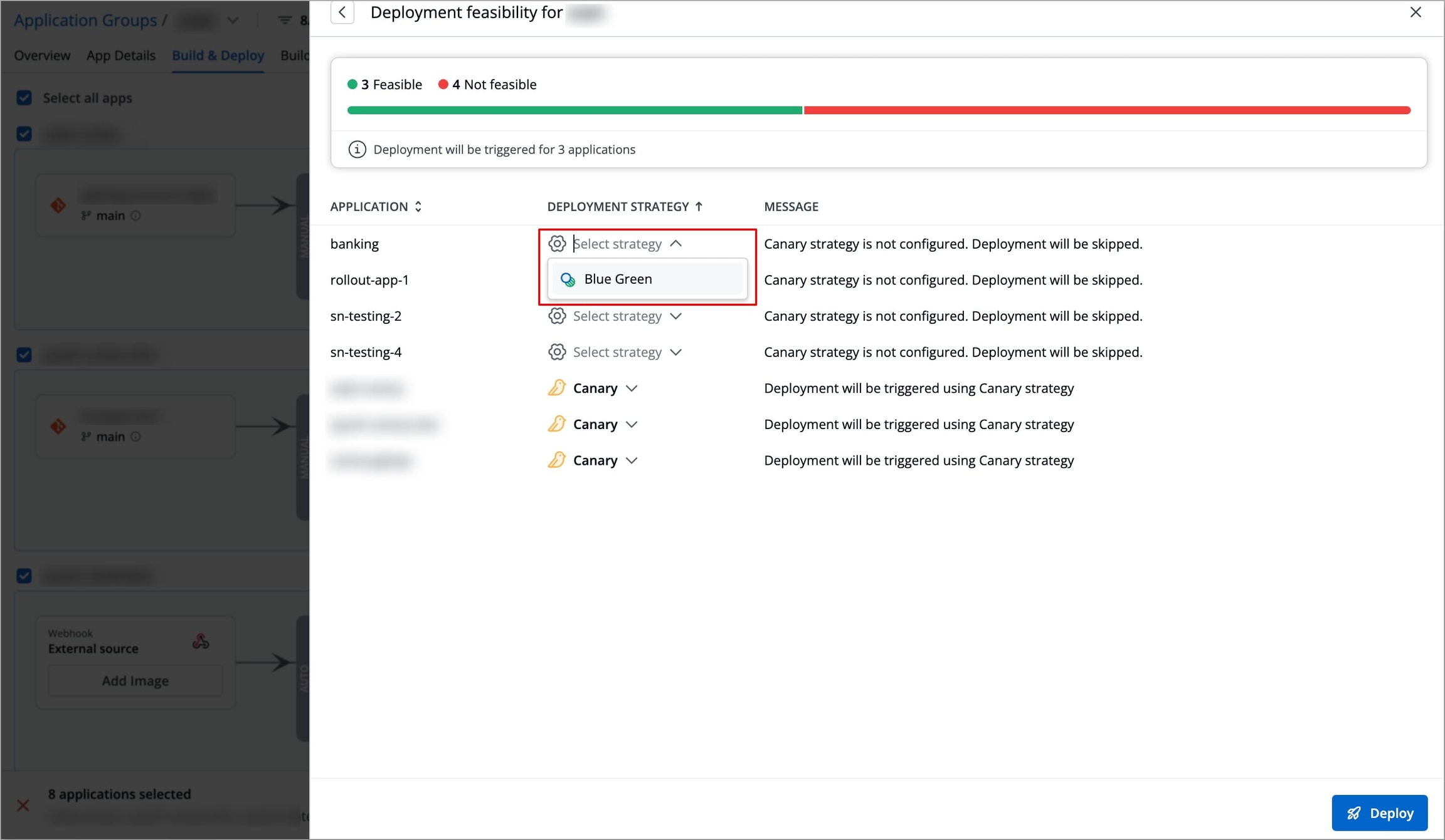 Deployment feasibility page will open; in case for any application, the selected deployment strategy is not configured, you can select one of the configured strategies for that application. If you do not select a configured deployment strategy, deployment will be skipped for that particular application.