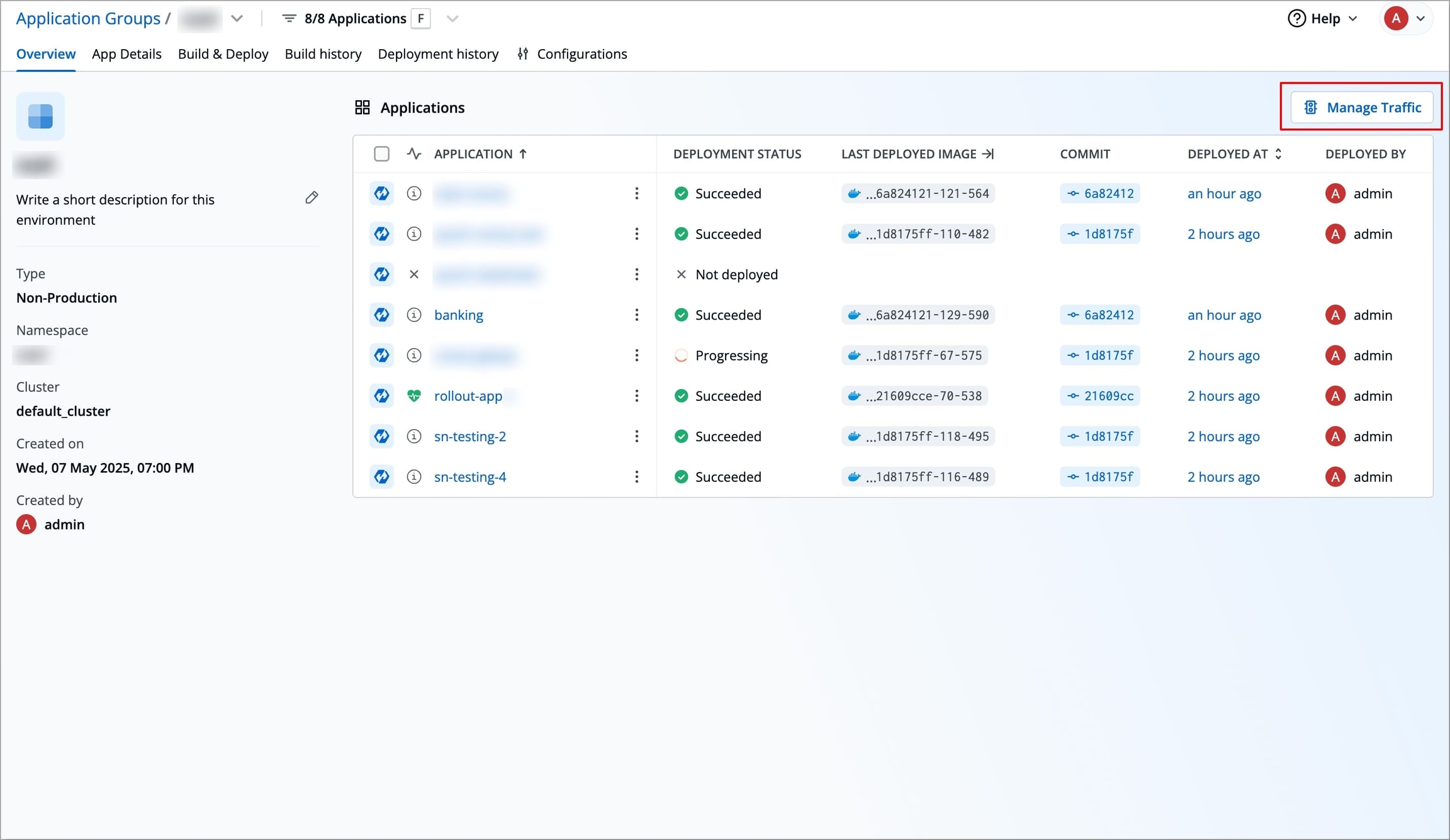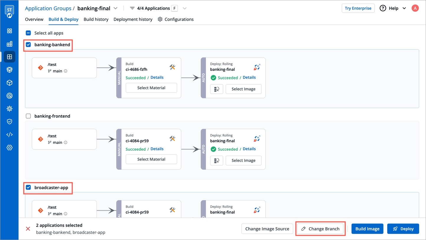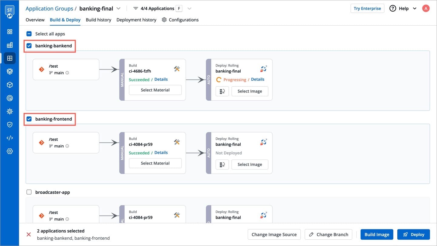 The Build & Deploy tab of your application group helps you deploy one or more applications in bulk.