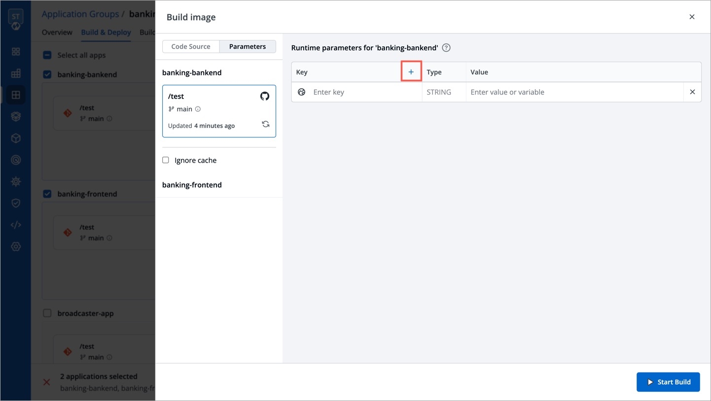 Figure 8: Entering Key-Value Pair You may follow the above steps for other applications too, and then click Start Build.