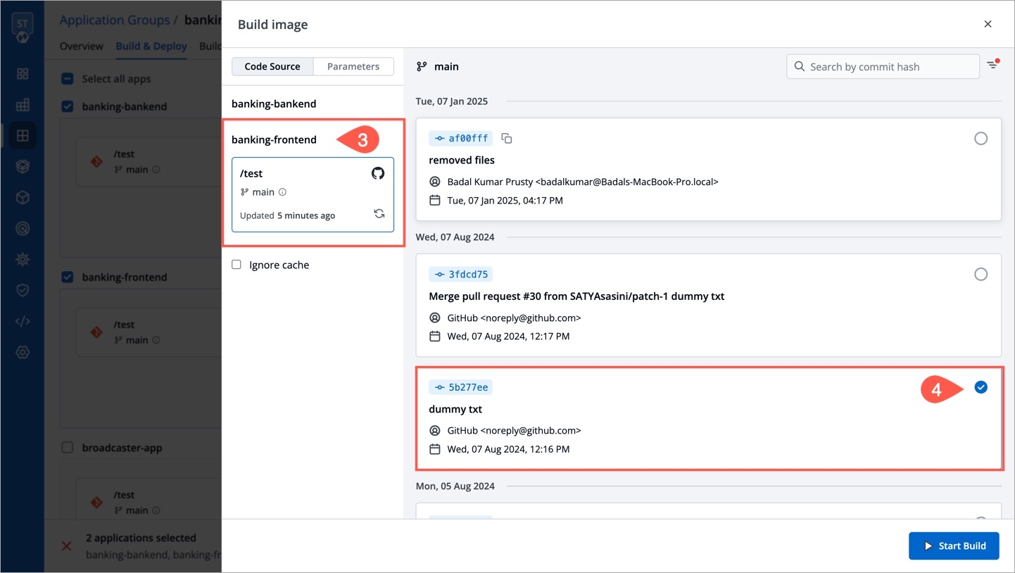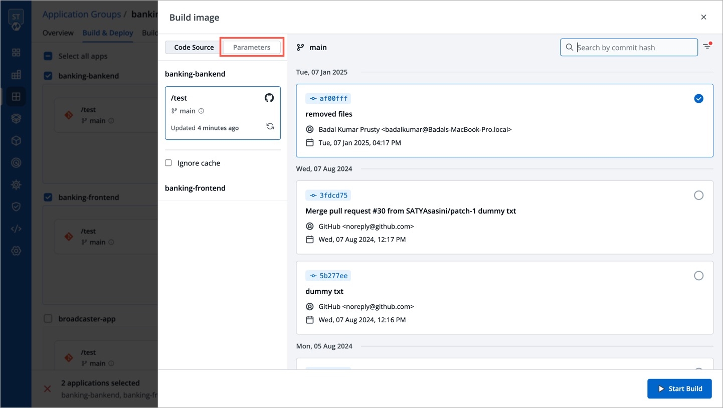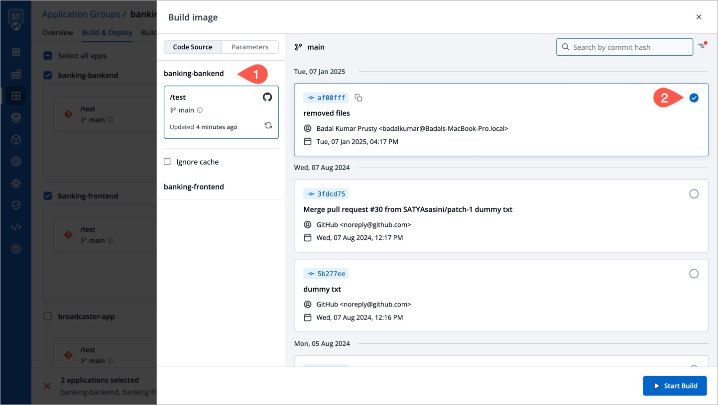 Build imagescreen opens. Select the application and the commit for which you want to trigger the CI build.