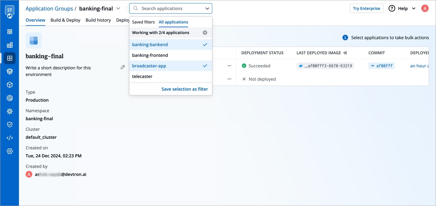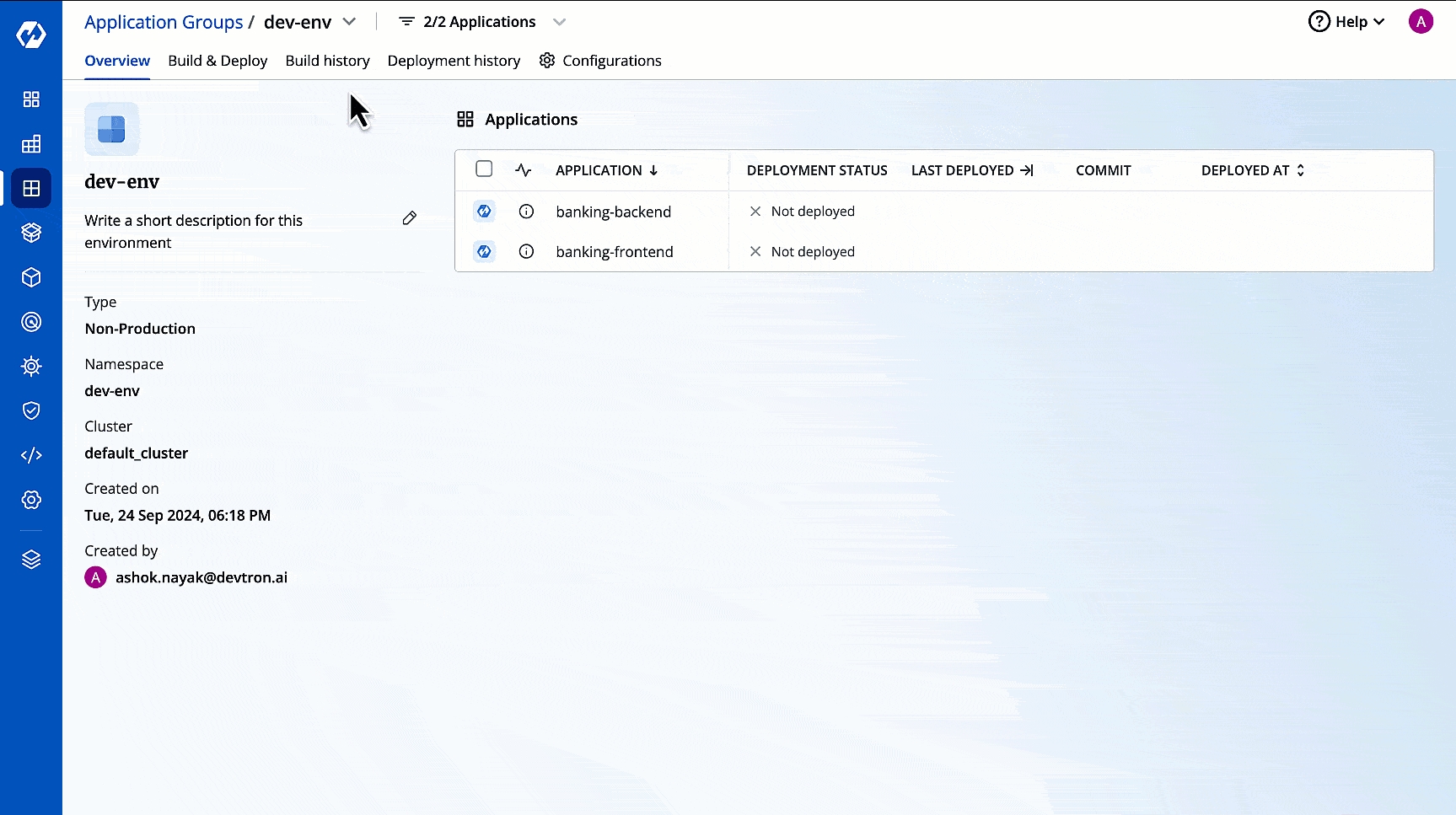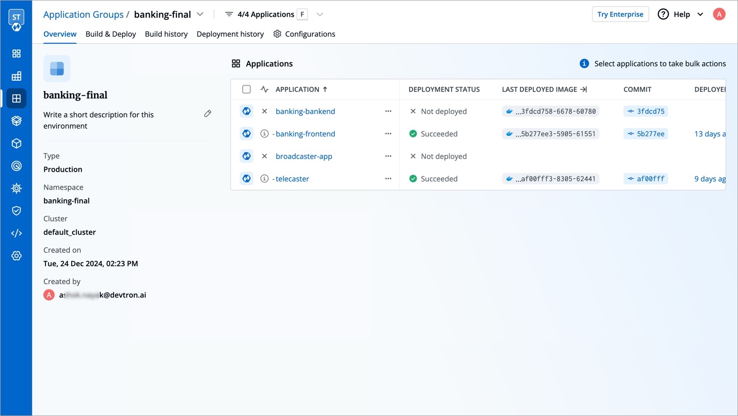 Application groups in Devtron streamline the deployment of microservices by enabling you to build and deploy multiple applications simultaneously. This feature is particularly beneficial when your microservices are interdependent, as a change in one service often triggers the need to redeploy others.