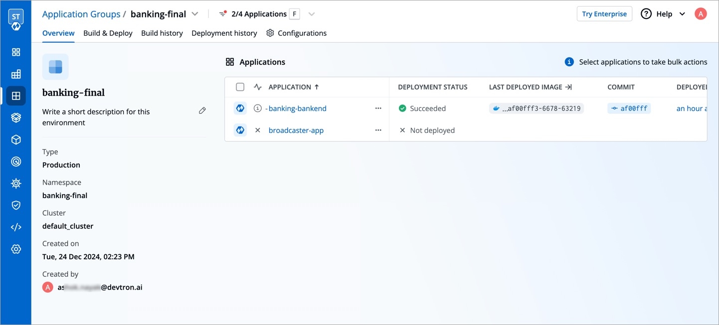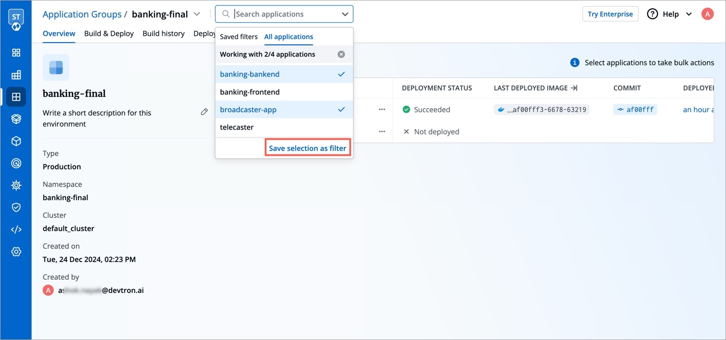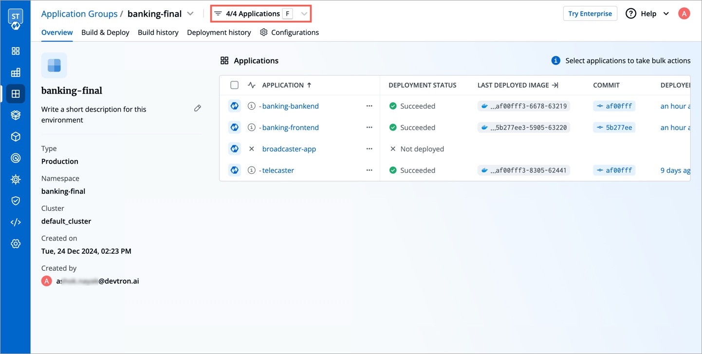 Application groups in Devtron streamline the deployment of microservices by enabling you to build and deploy multiple applications simultaneously. This feature is particularly beneficial when your microservices are interdependent, as a change in one service often triggers the need to redeploy others.