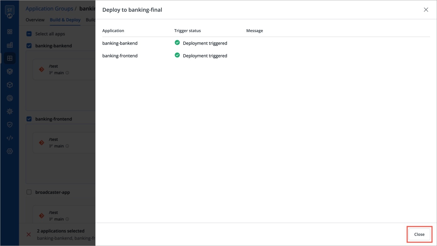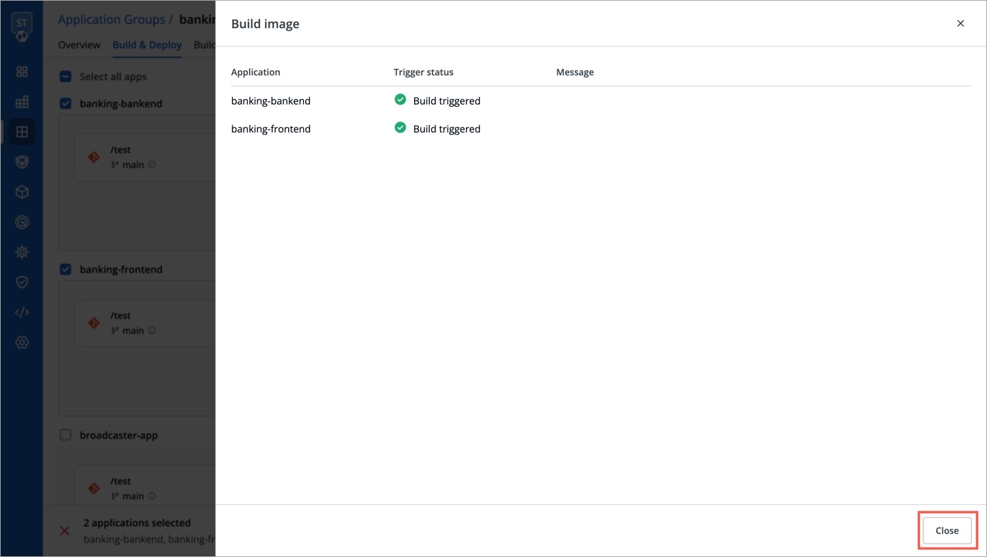 The Build & Deploy tab of your application group enables you to trigger the CI builds of one or more applications in bulk.