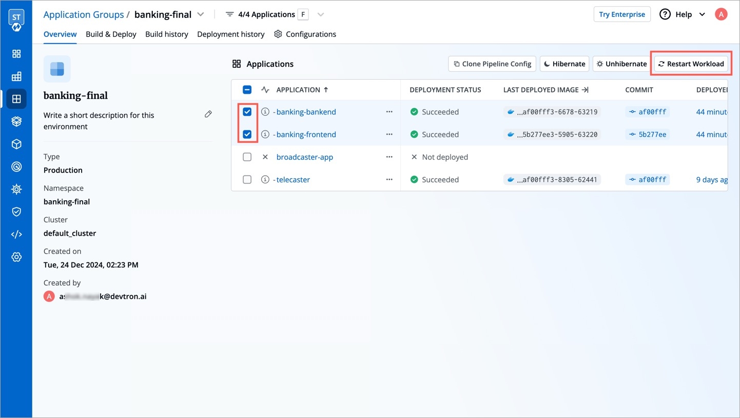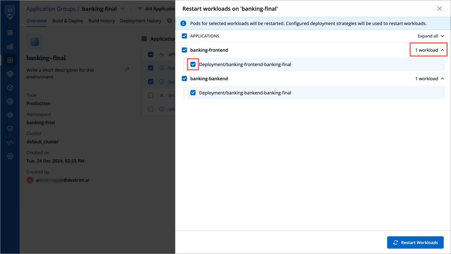 Use the checkboxes to choose the applications whose workloads you wish to restart, and click the Restart Workload button.