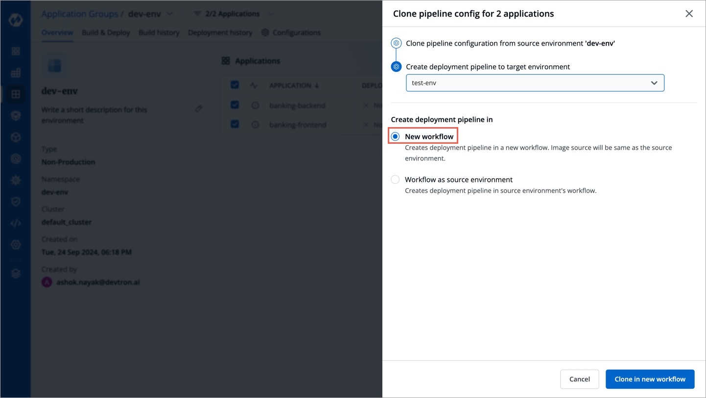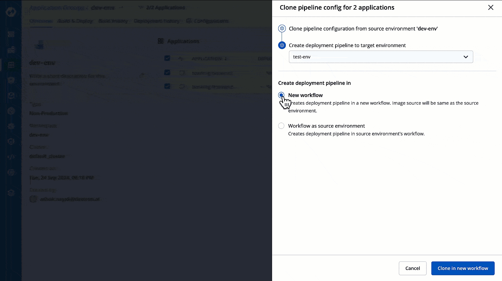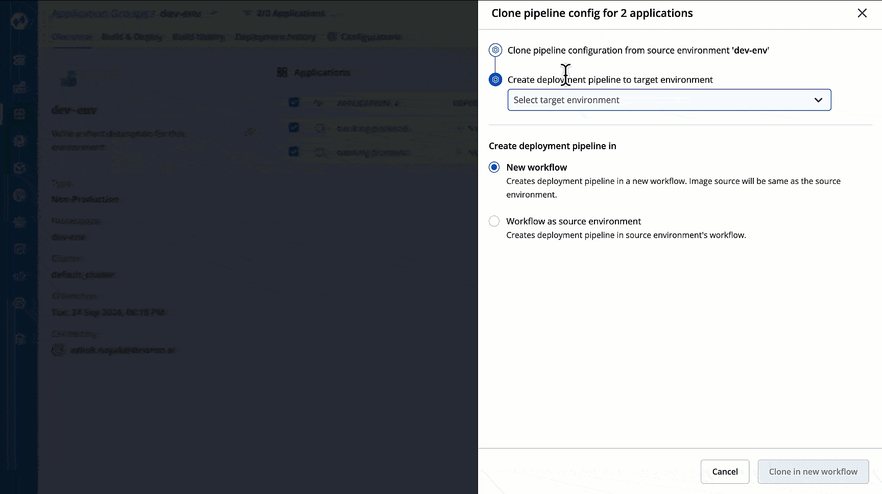 The cloning process will skip if a CD pipeline (for the target environment) already exists in the chosen application's workflow. You can view this in the clone status generated after the above process.