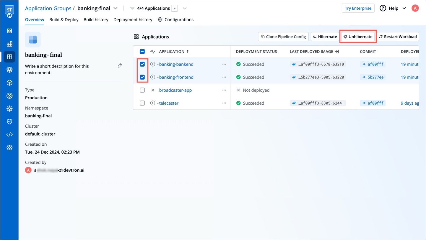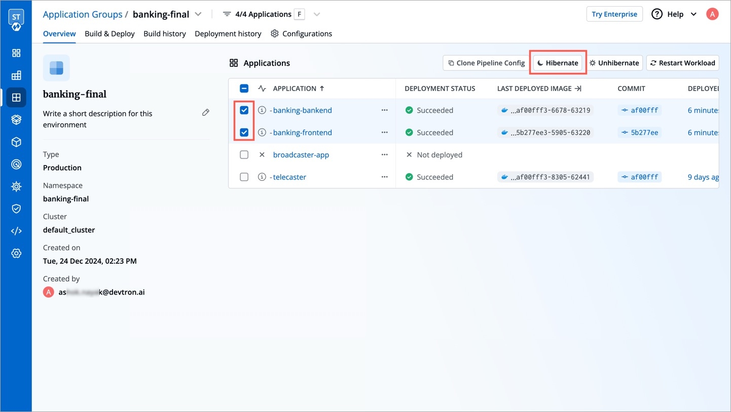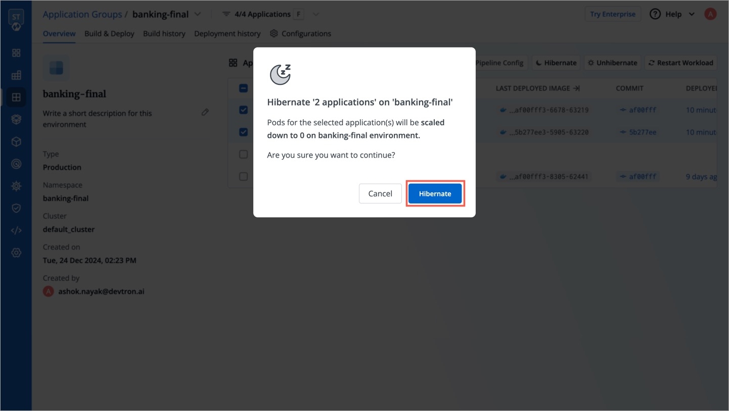 Since every application comes with an option to hibernate, the same is true for application groups. Using application group, you can hibernate one or more applications belonging to the same environment if you do not want them to consume resources (replica count will be set to 0).