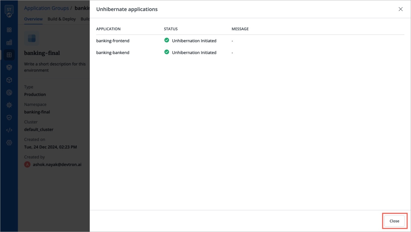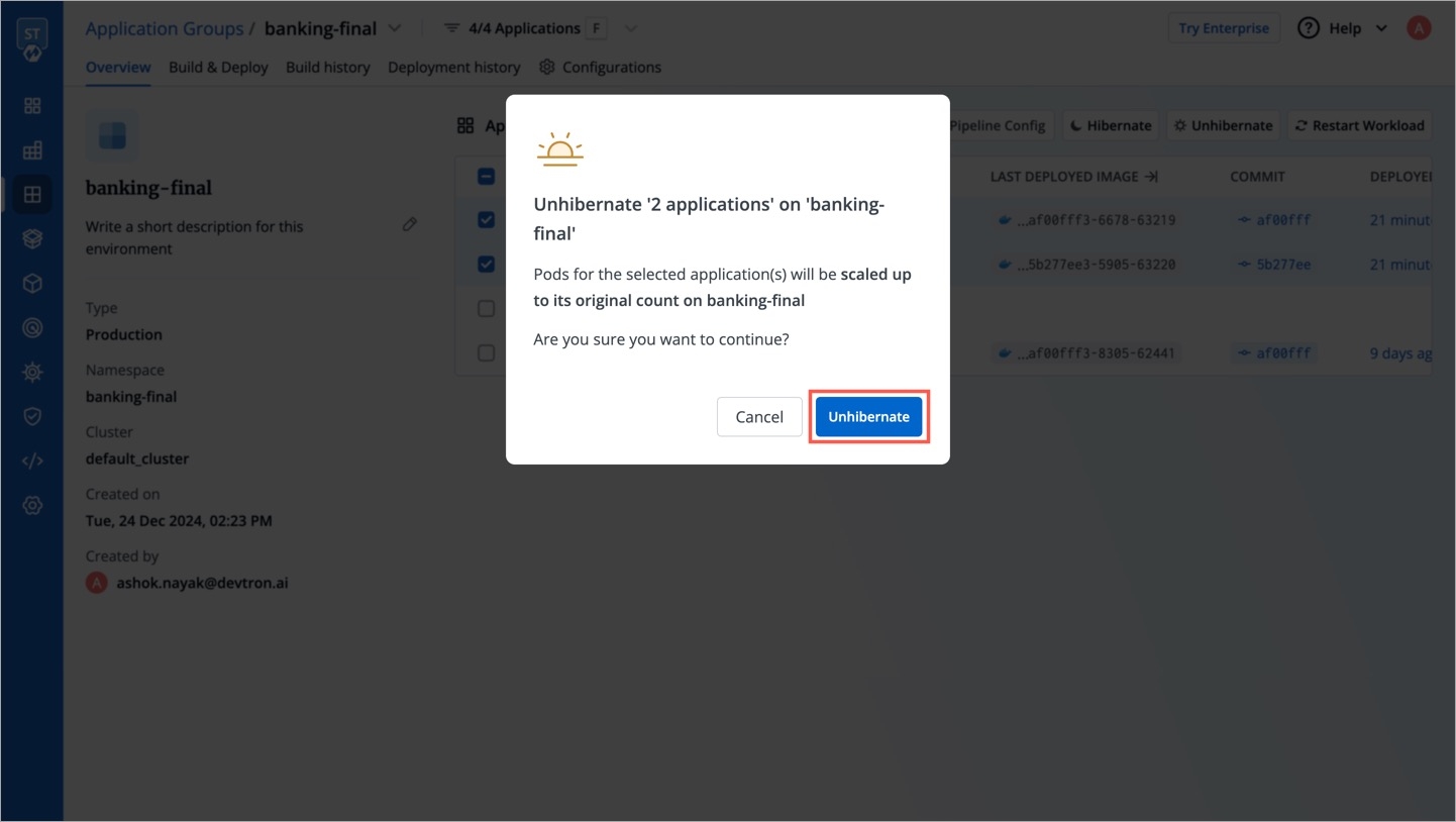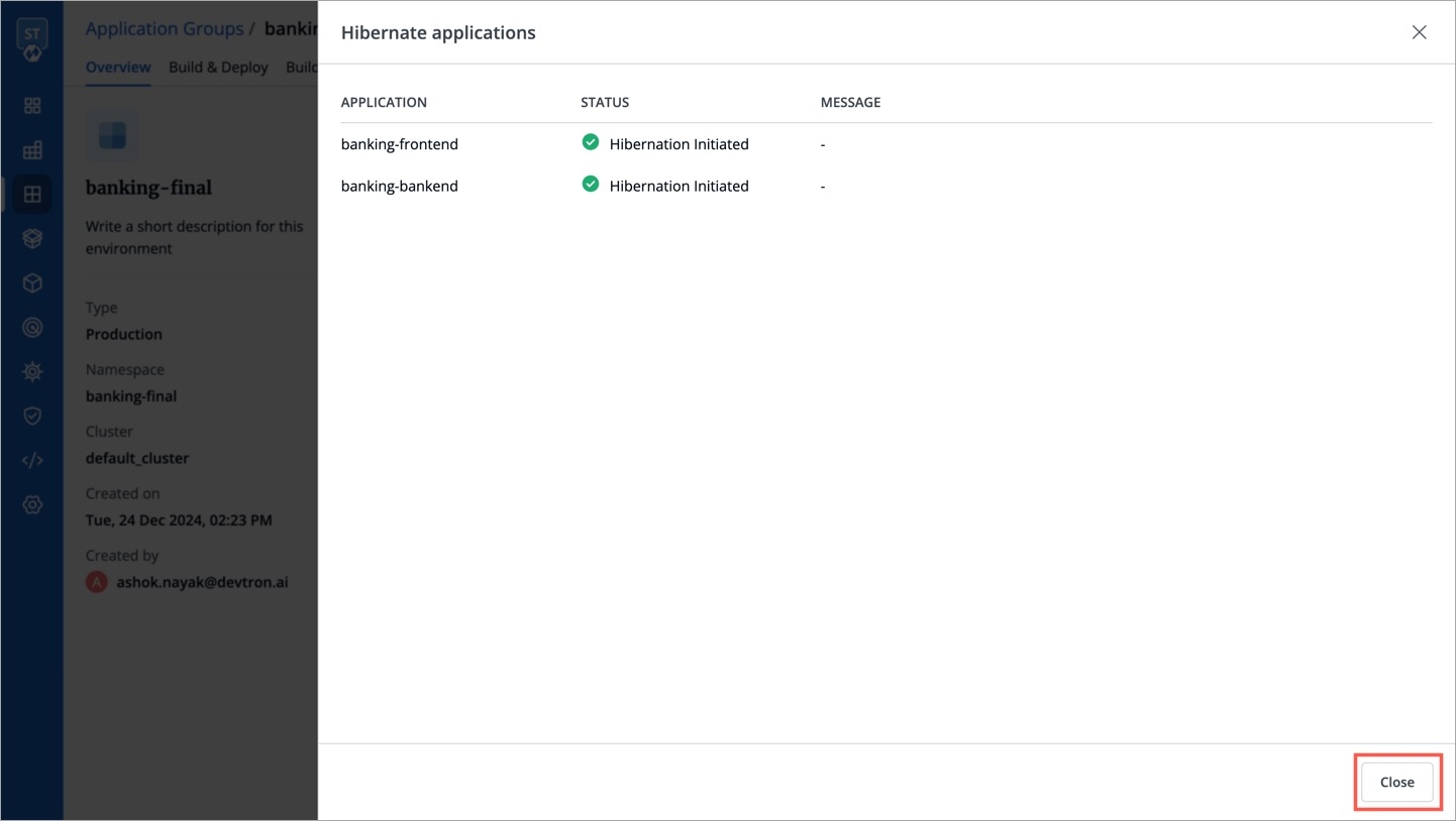 Since every application comes with an option to hibernate, the same is true for application groups. Using application group, you can hibernate one or more applications belonging to the same environment if you do not want them to consume resources (replica count will be set to 0).