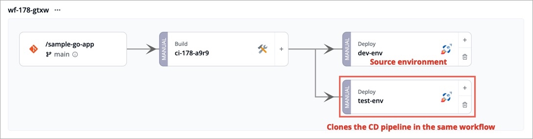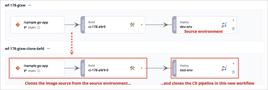 New Workflow: Creates a new workflow and clones the source CI and CD pipeline. Gives you the flexibility to tweak the cloned CI (e.g., changing code branch for build) too.