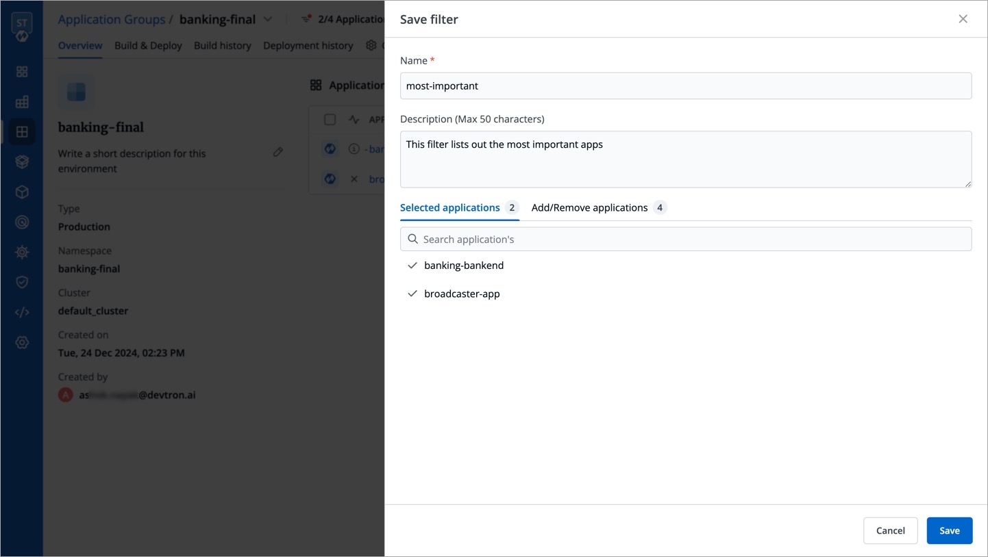 Assume you have multiple applications (maybe 10, 50, 100, or more) showing up in an application group. If you want to limit your operations (build/deploy/other) to a specific set of applications, the filter feature will help you narrow down the list. Thus, you will see only those applications you select from the filter (be it on the Overview page, Build & Deploy page, and so on.)