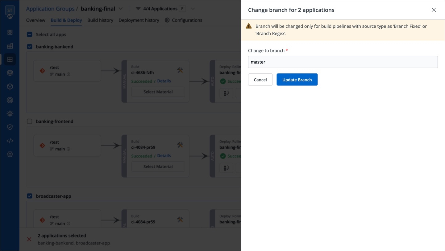 Assume you have a few applications whose build pipelines fetch from the main branch of your code repository. However, you decided to maintain a master branch, and you want all the upcoming CI builds to consider the master branch as the source. Devtron provides you the option to change the branch at both levels—individual application as well as application group.