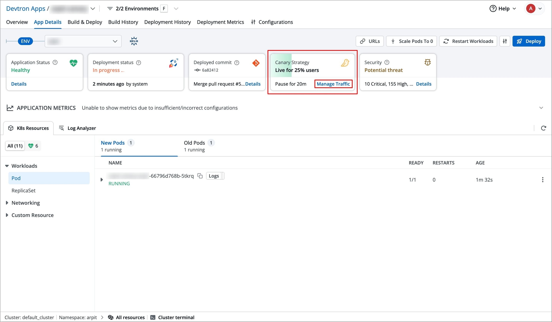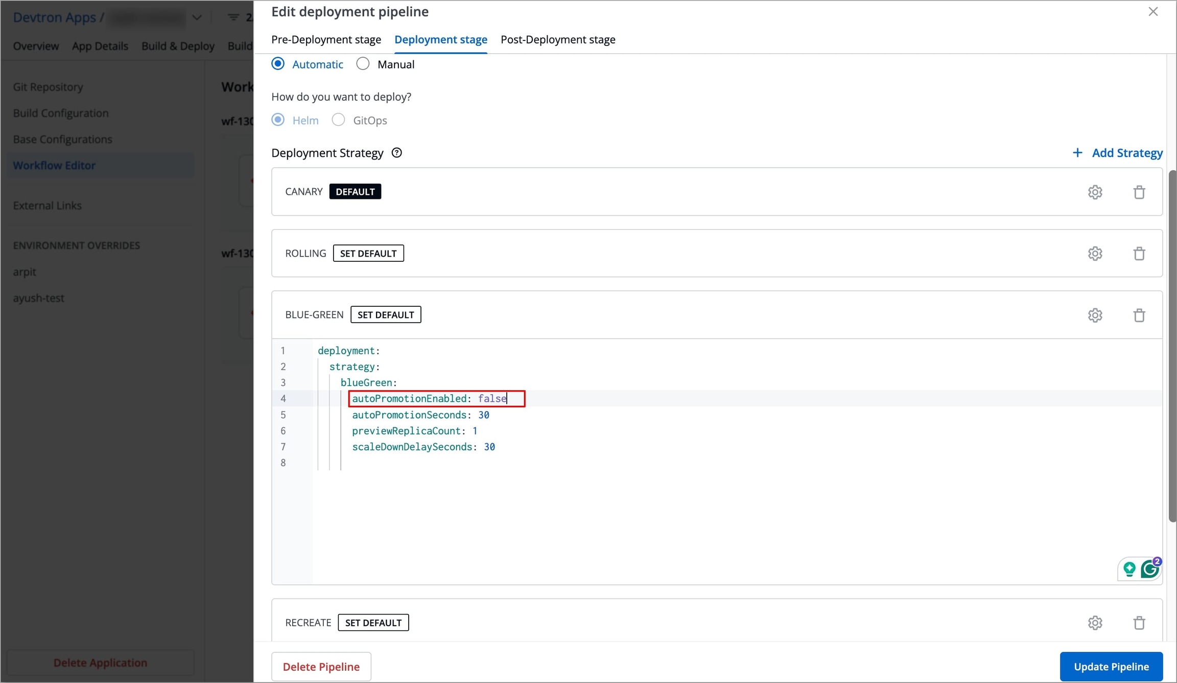Devtron helps you to manage your Canary and Blue-Green deployments by providing visibility and easy controls to manage how new versions (releases) are shared with users.