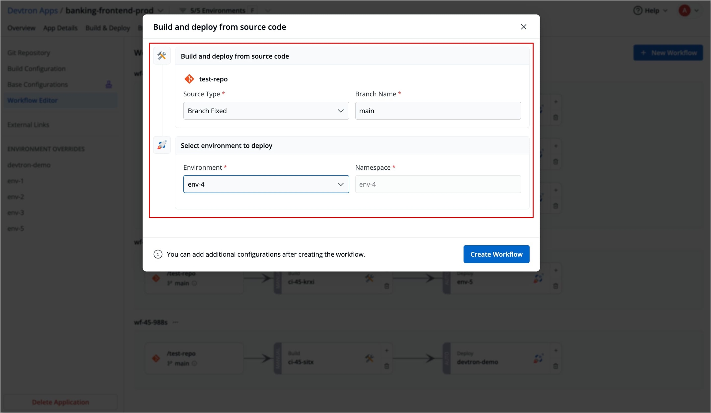 Click Create Workflow; a workflow with both build and deployment pipelines will be created.