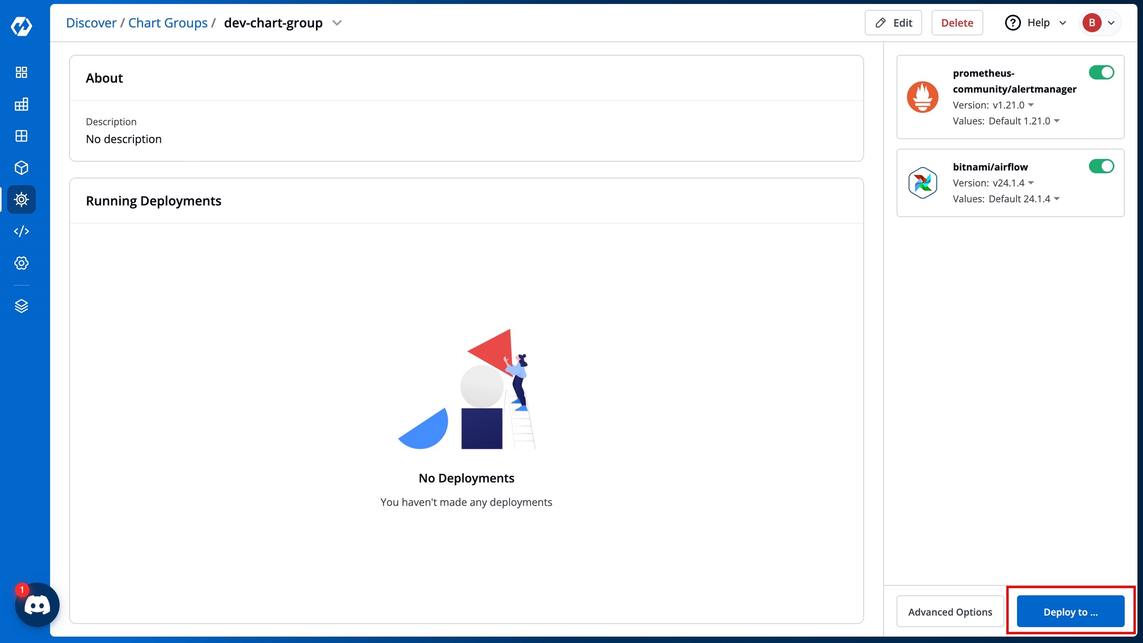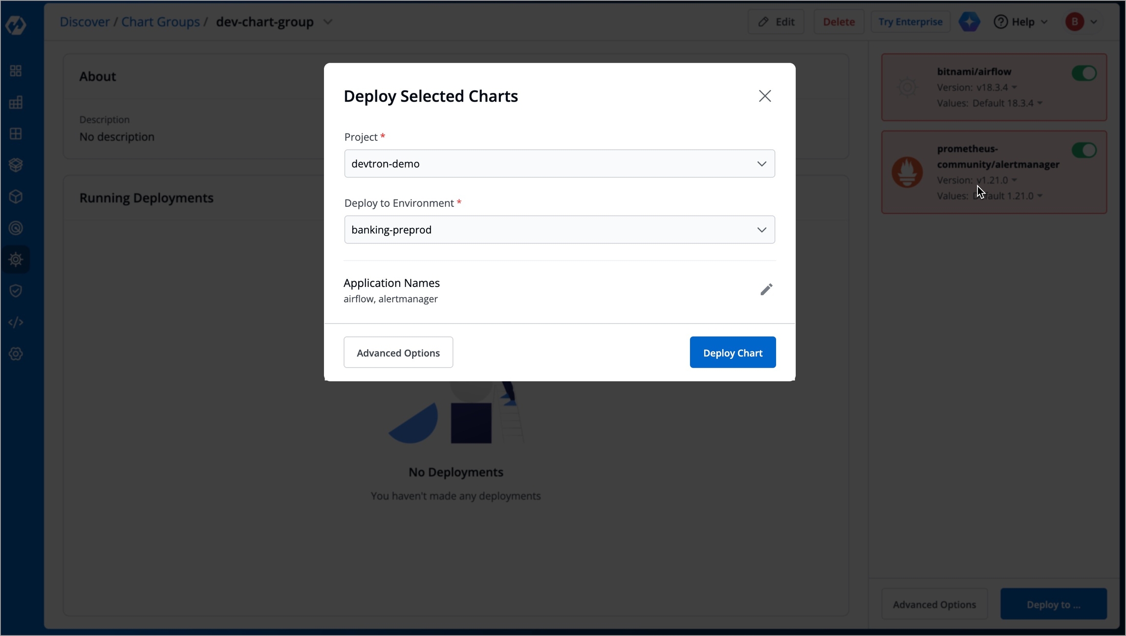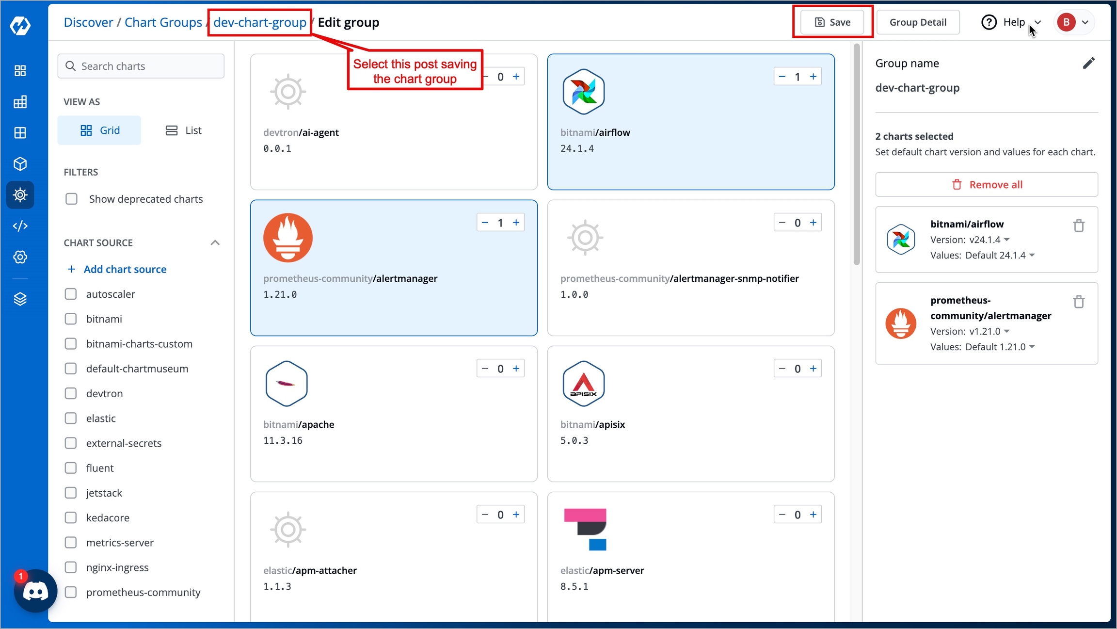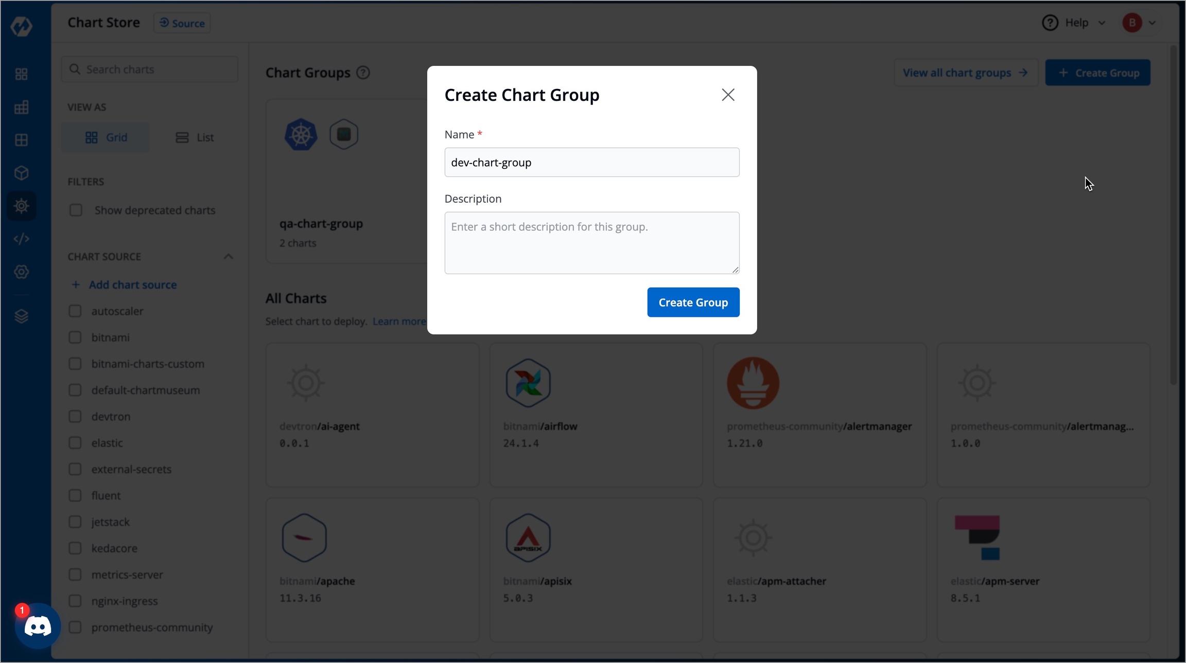 When setting up a new environment or a microservice, or when your application requires multiple Helm charts, you can simply group the required charts into a chart group. You can then view, manage, and deploy related charts together in one place instead of searching and installing each one individually.