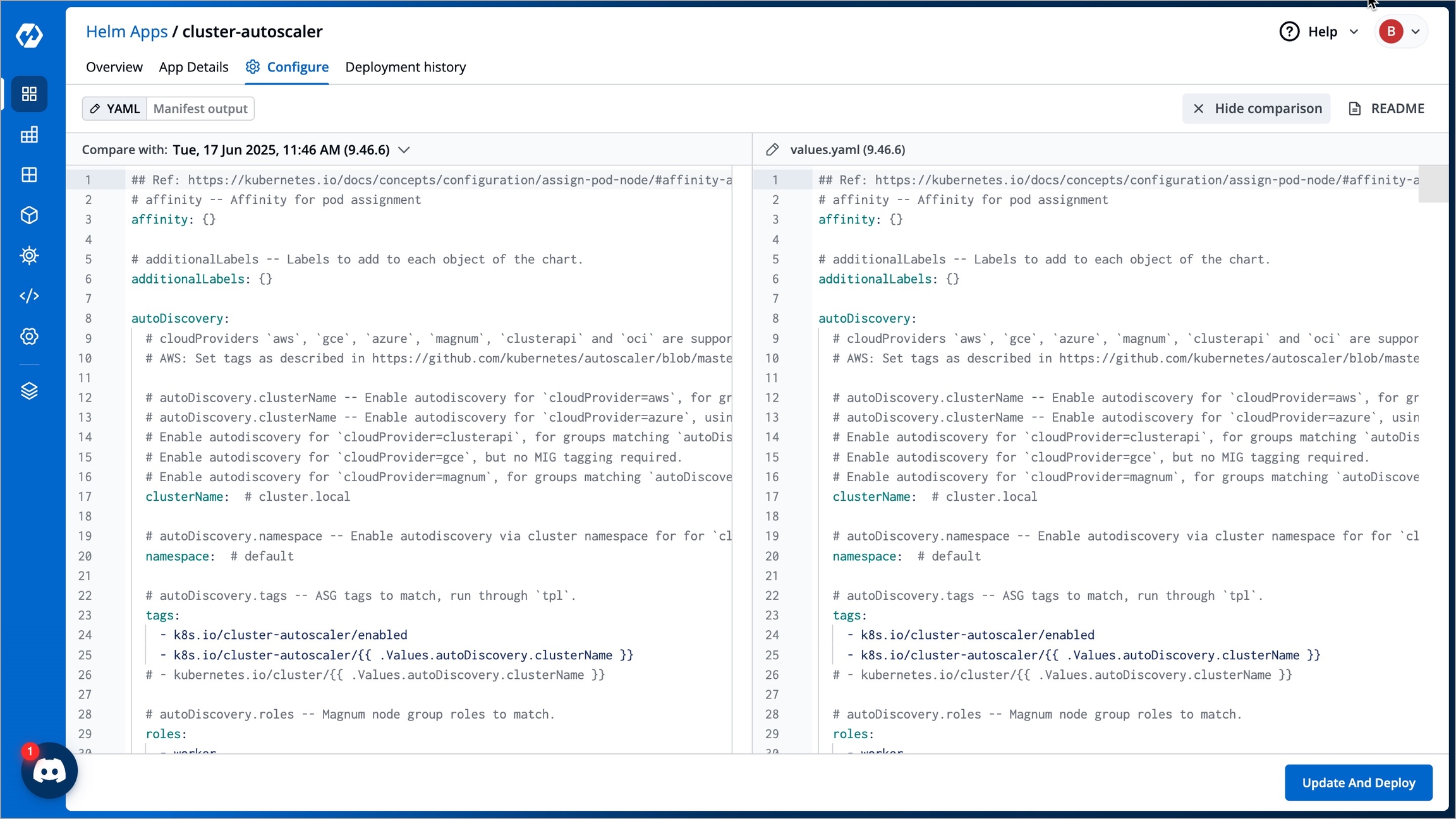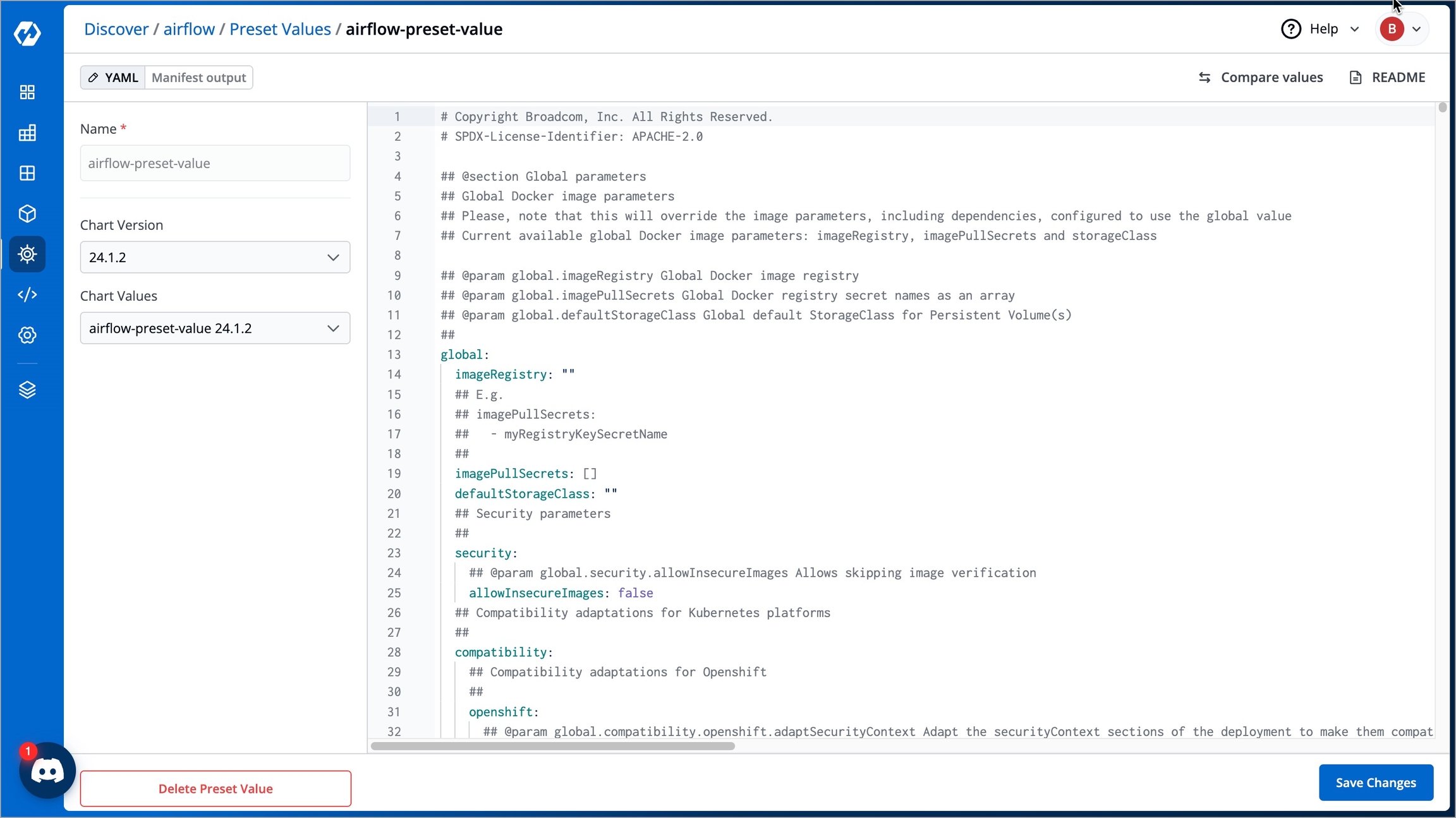 You can also compare the existing configured values of the previous chart version with the default values of the newer chart version by clicking the Compare Values button in the top-right corner of the page.