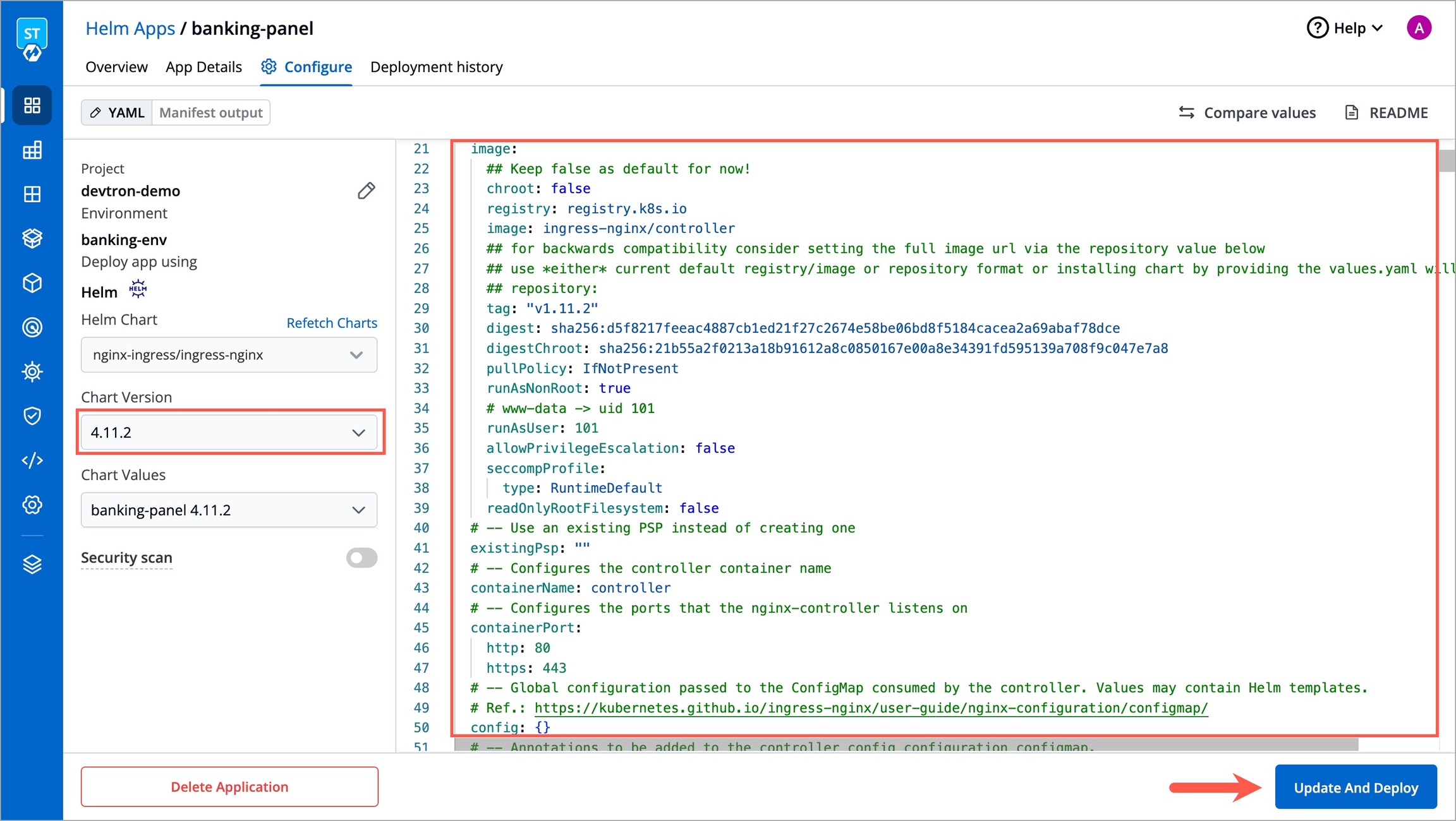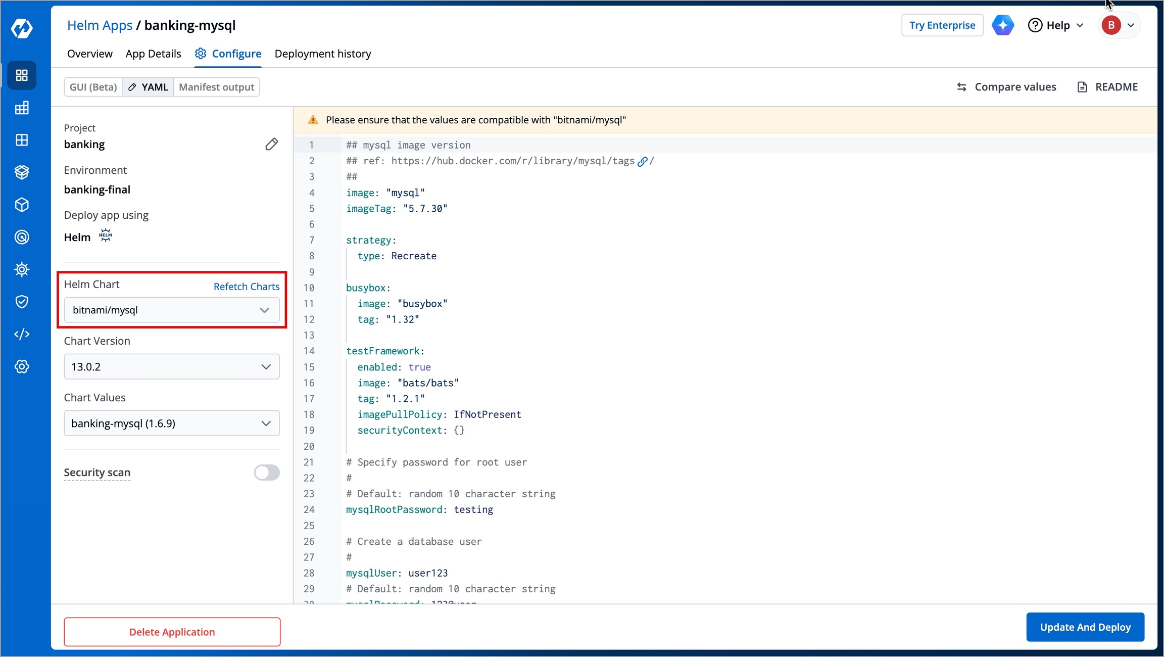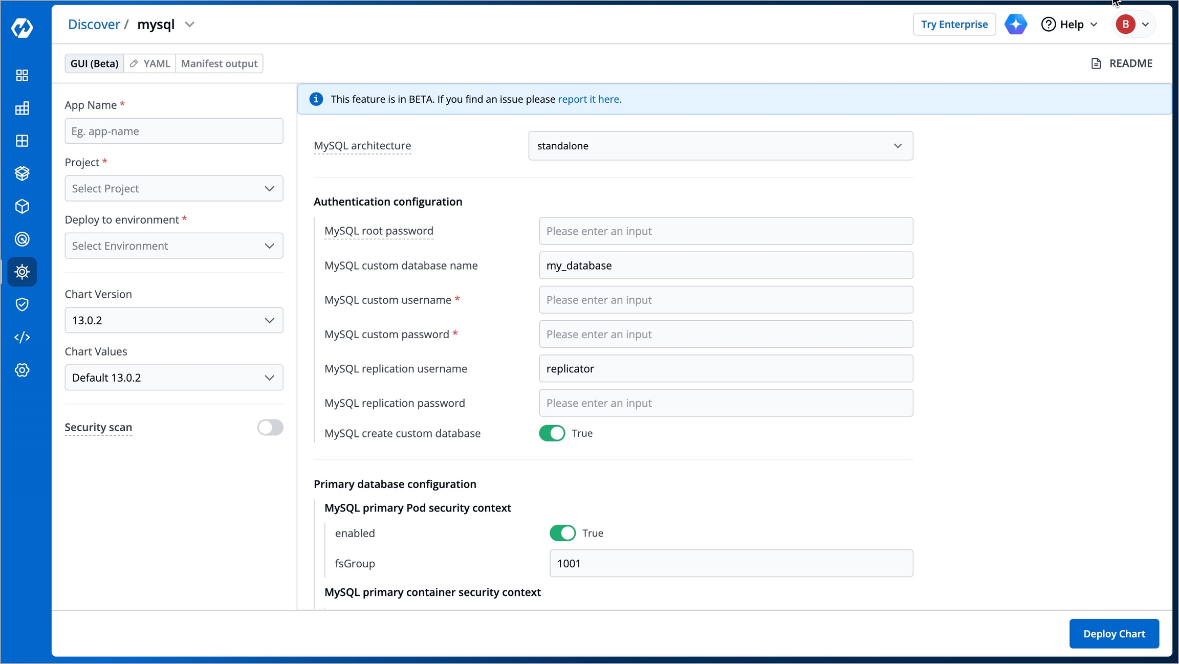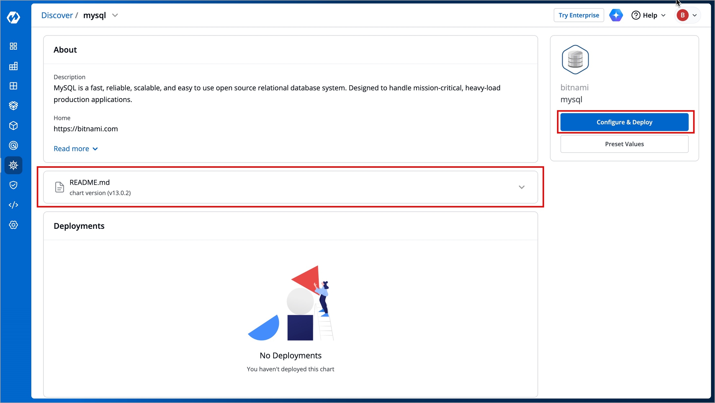 Click Configure & Deploy. Configuring a Helm chart gives you the flexibility to customize it to your needs instead of relying on the default values of the chart.