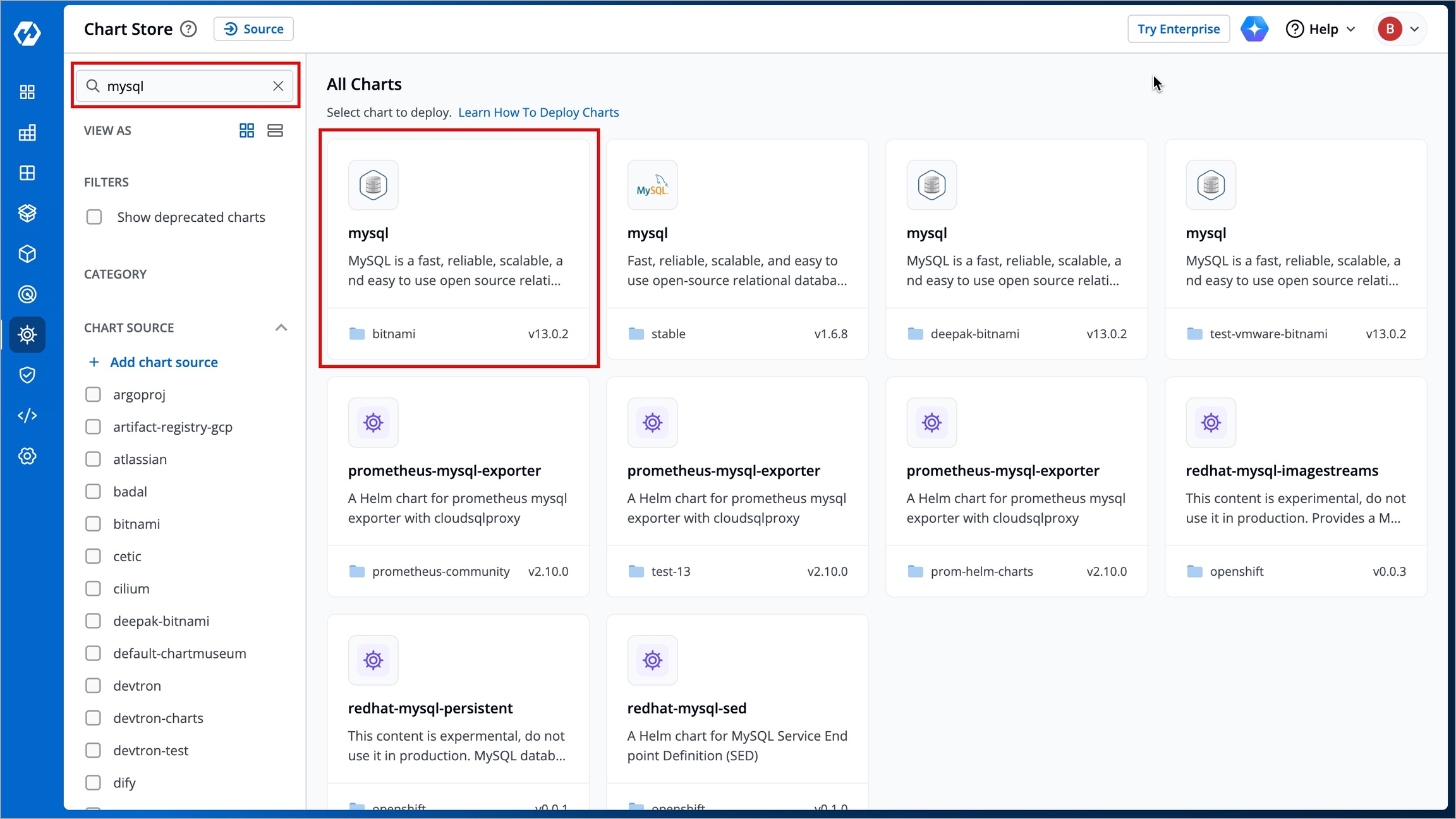 mySQLin the search bar at the top-left corner of the Chart Store page.Select