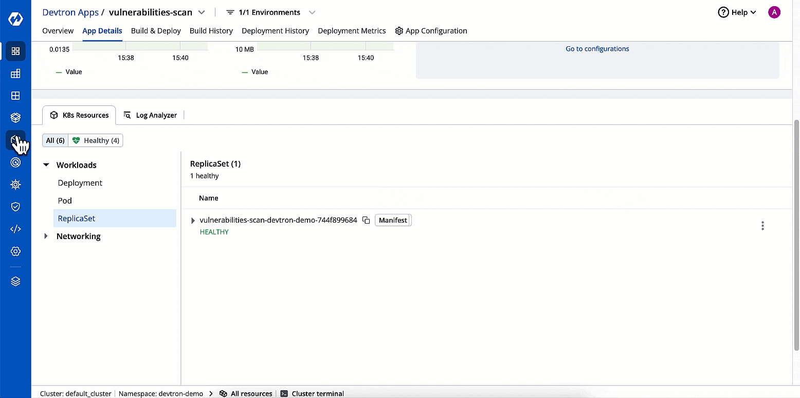 K8s Resources Sub Tab: You can view the scan results for specific workloads (Pods, Deployments, ReplicaSets) under K8s Resources Sub Tab.