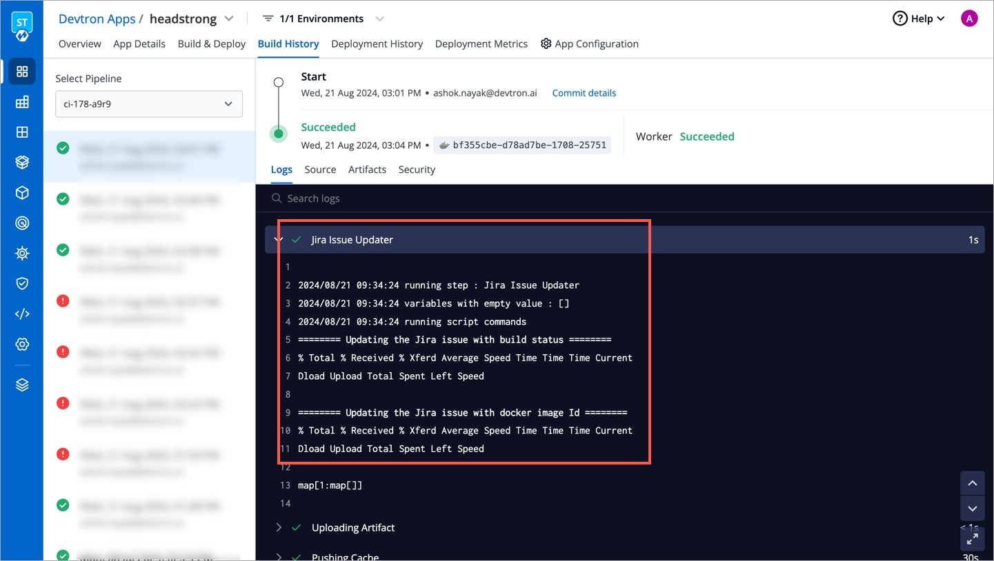 The Jira Issue Updater plugin extends the capabilities of Devtron CI by allowing updates to Jira issues directly from the pipeline. It can add build pipeline status and docker image ID as a comment on Jira tickets, keeping the issue tracking synchronized with your CI processes.