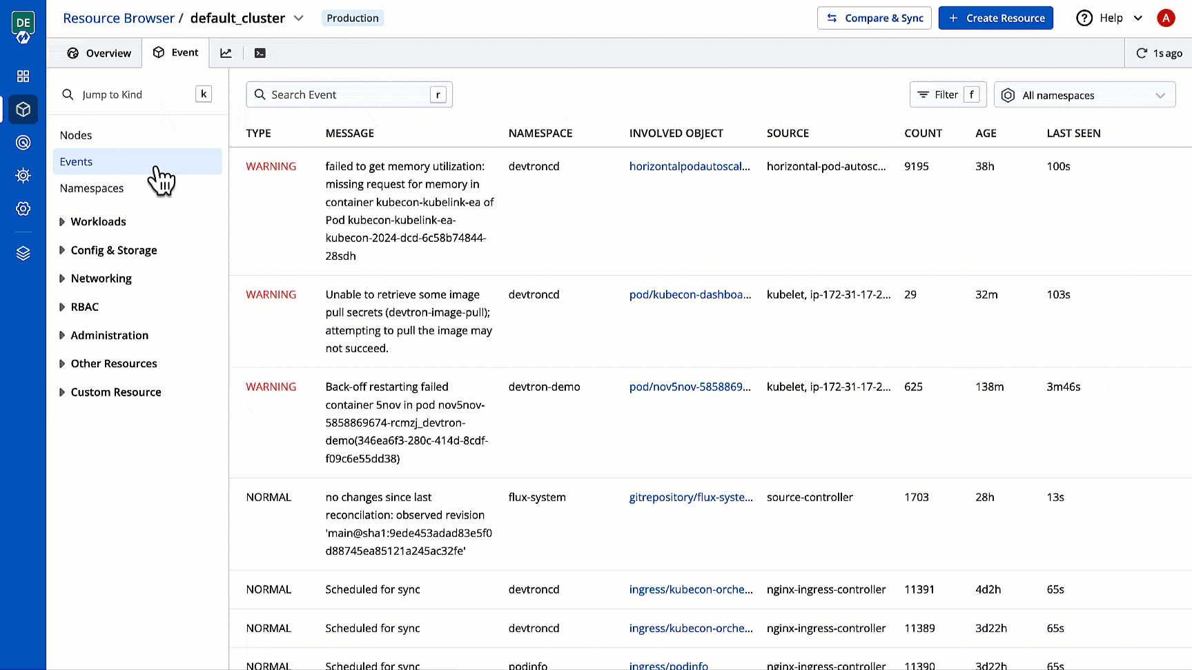 You can monitor activities like creation, deletion, updation, scaling, or errors in the resources involved. Refer Events to learn more.
