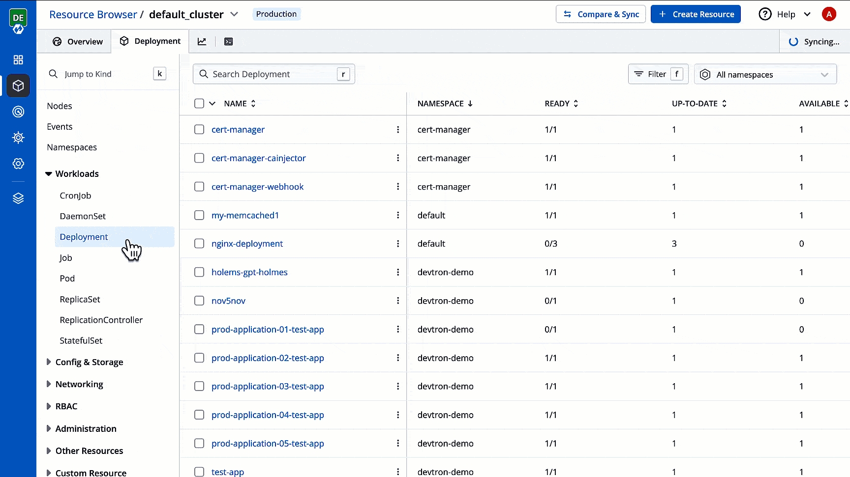 You can use the checkbox to select the resources/workloads you wish to delete or restart.