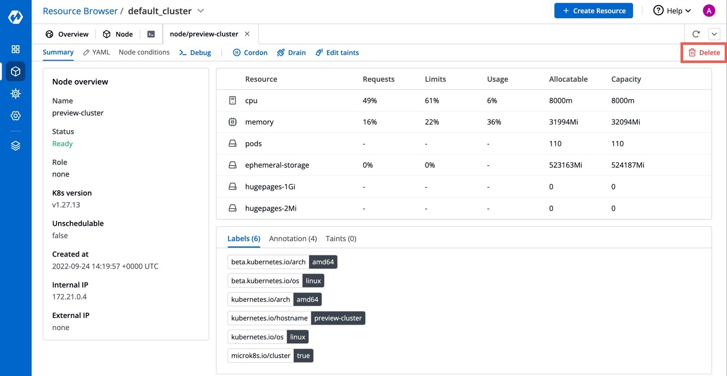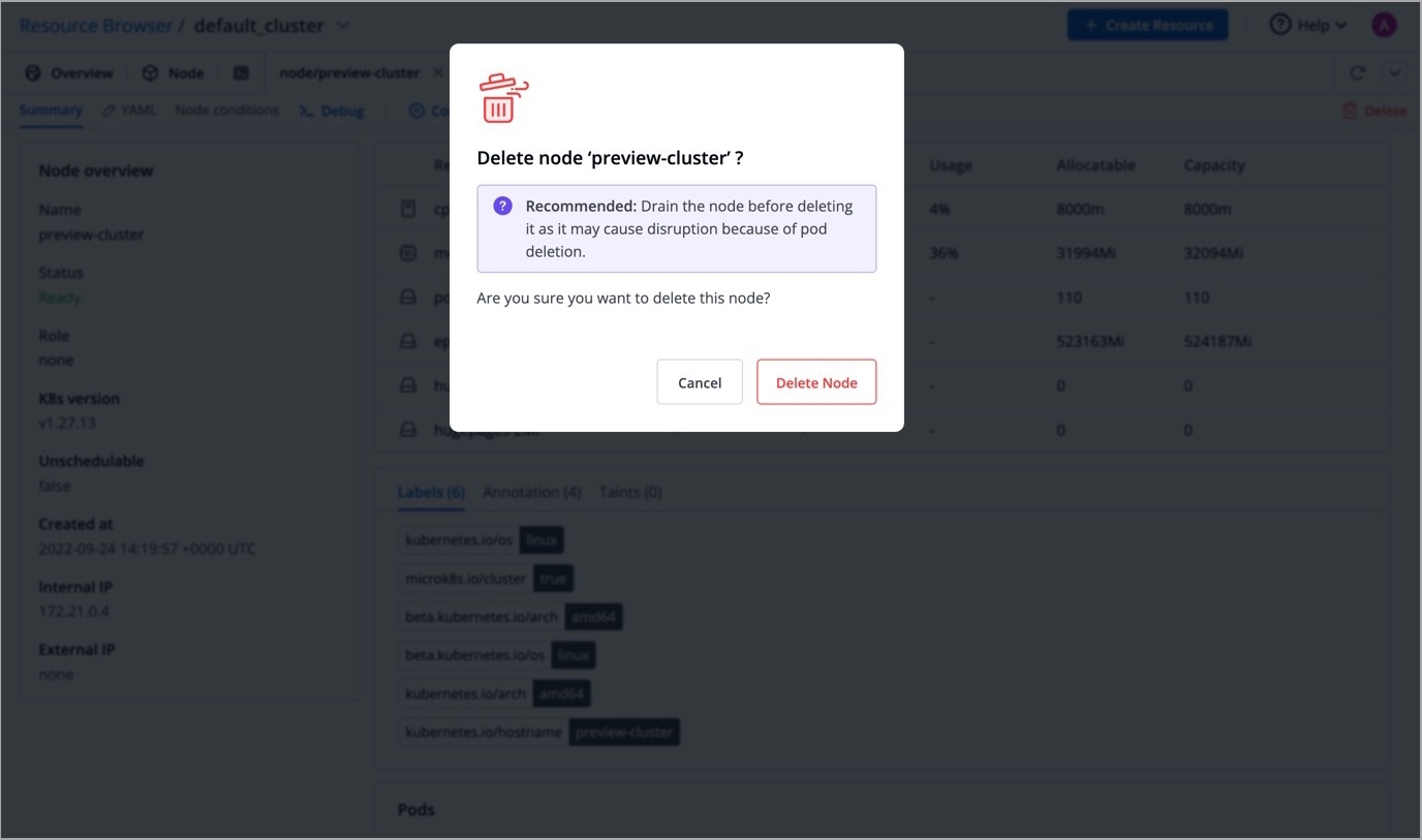Similarly, you can uncordon a node by clicking Uncordon