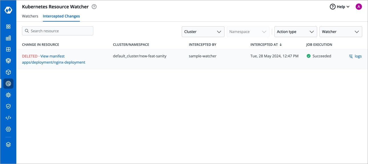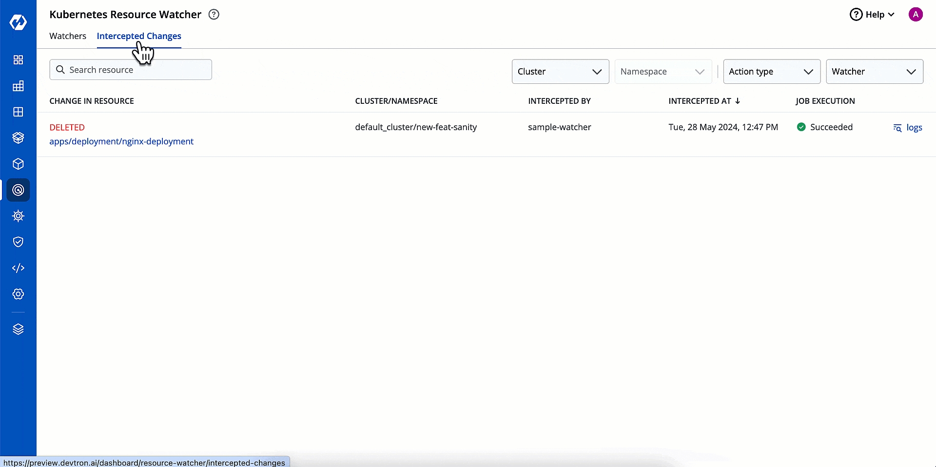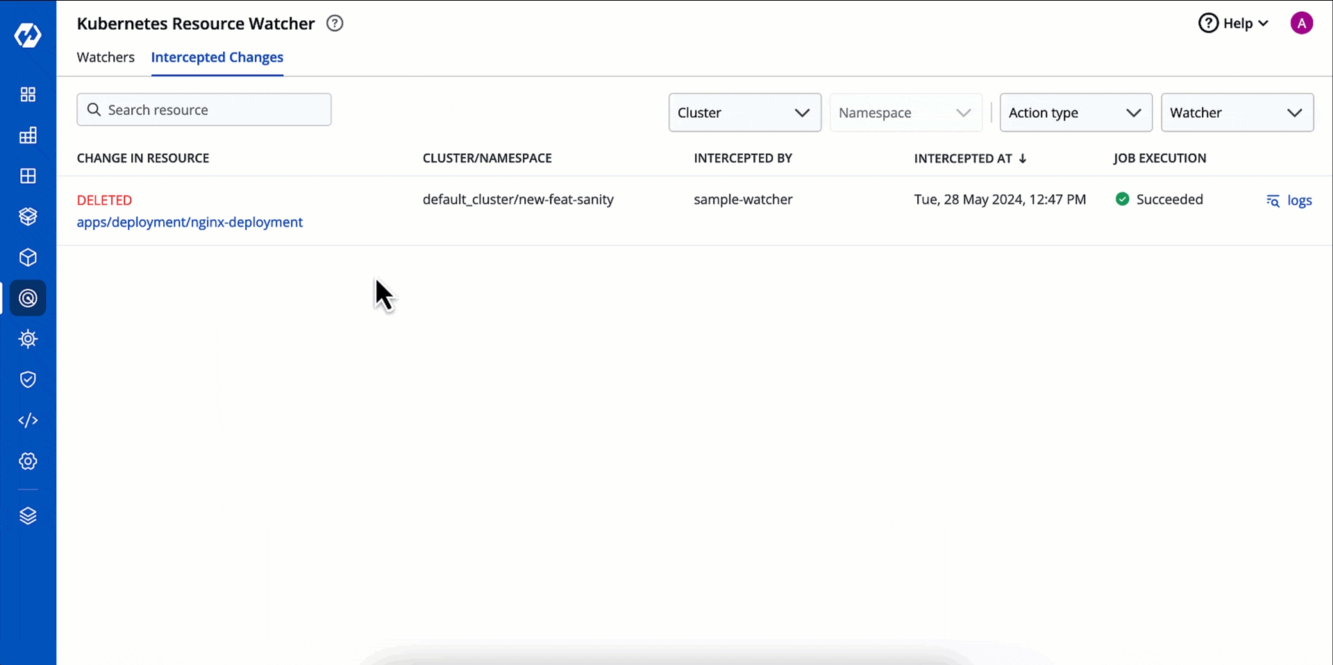 You can check the logs of the job executed when the Resource Watcher intercepts any change by clicking logs.