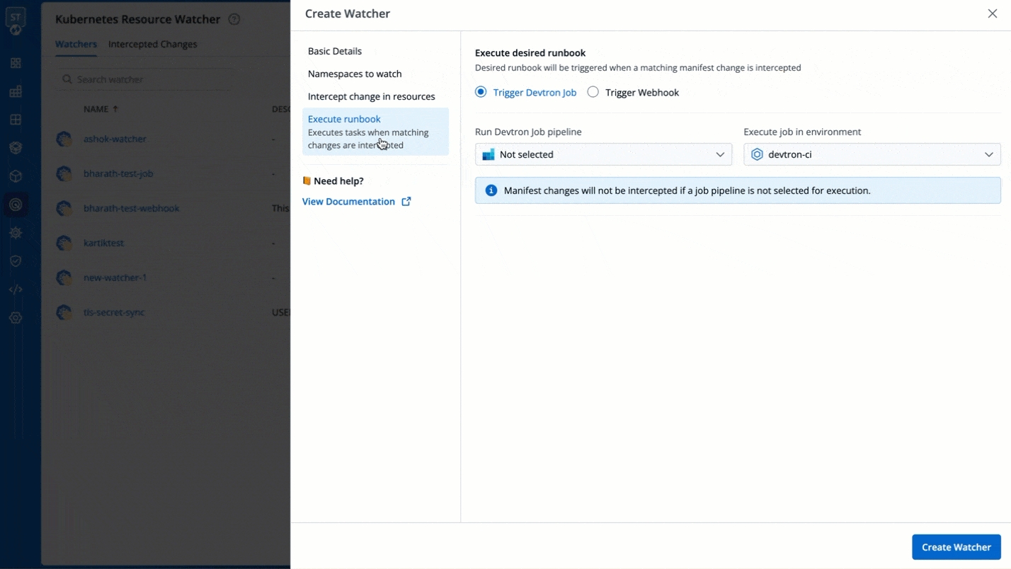 Choose your preferred Devtron job pipeline from the Run Devtron Job pipeline drop-down box. The pipelines configured while creating a job are displayed as options in the Run Devtron Job pipeline drop-down box. Unless a job pipeline is selected, the watcher will not intercept matching resource changes, even if defined conditions are met.