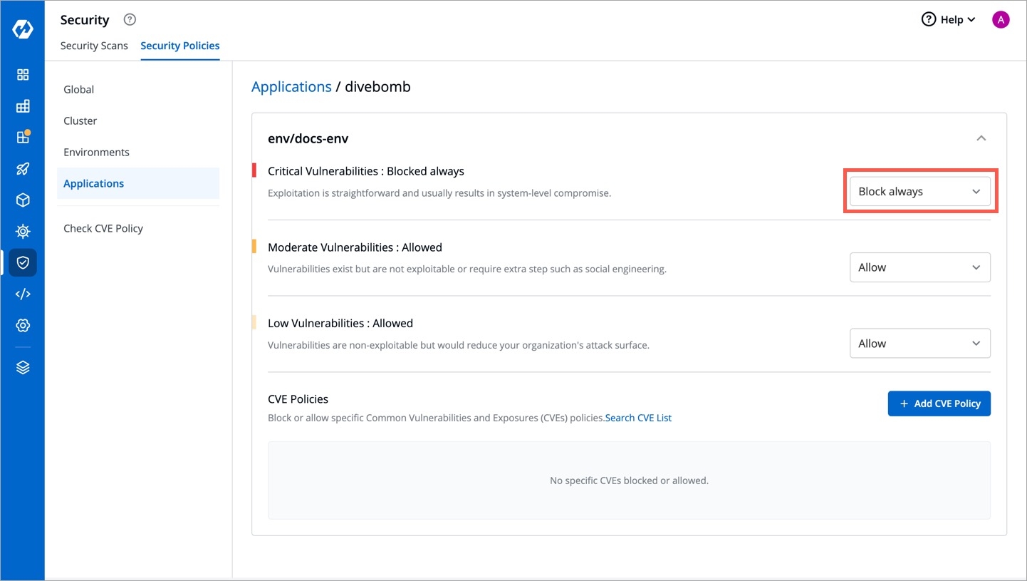 Let's say, you have defined a policy to block the deployment if critical vulnerabilities are found in a given application.