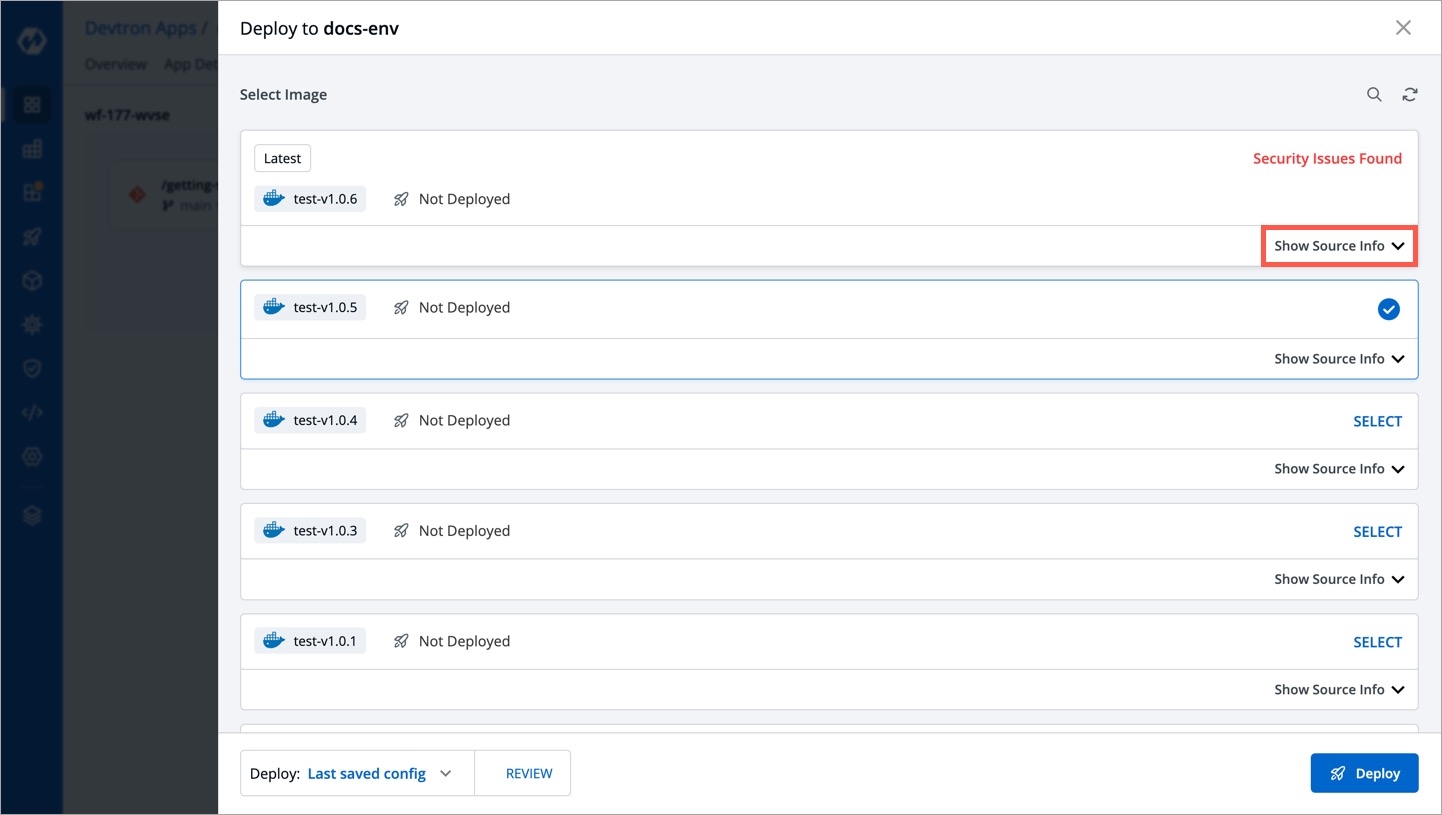 Figure 7: Selecting an Image As you can see, security issues were found in the scanned image, hence it is not available for selection. Click Show Source Info.